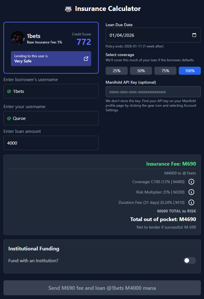 As discussed in Discord DMs, 633 mana has been deposited to purchase a C100 policy for this loan.