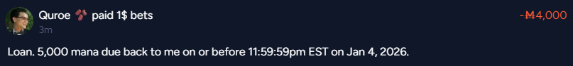 Guys, special offer: I’ll accept a loan from you with a -90% interest rate. You lend me 500-3000 mana, and I’ll owe you back 50-300 mana. Seems like a good deal , free and just a 3% order on your trades, tell me where to place, so you can earn some respect or whatever. Good deal - I always pay back negative-rate loans