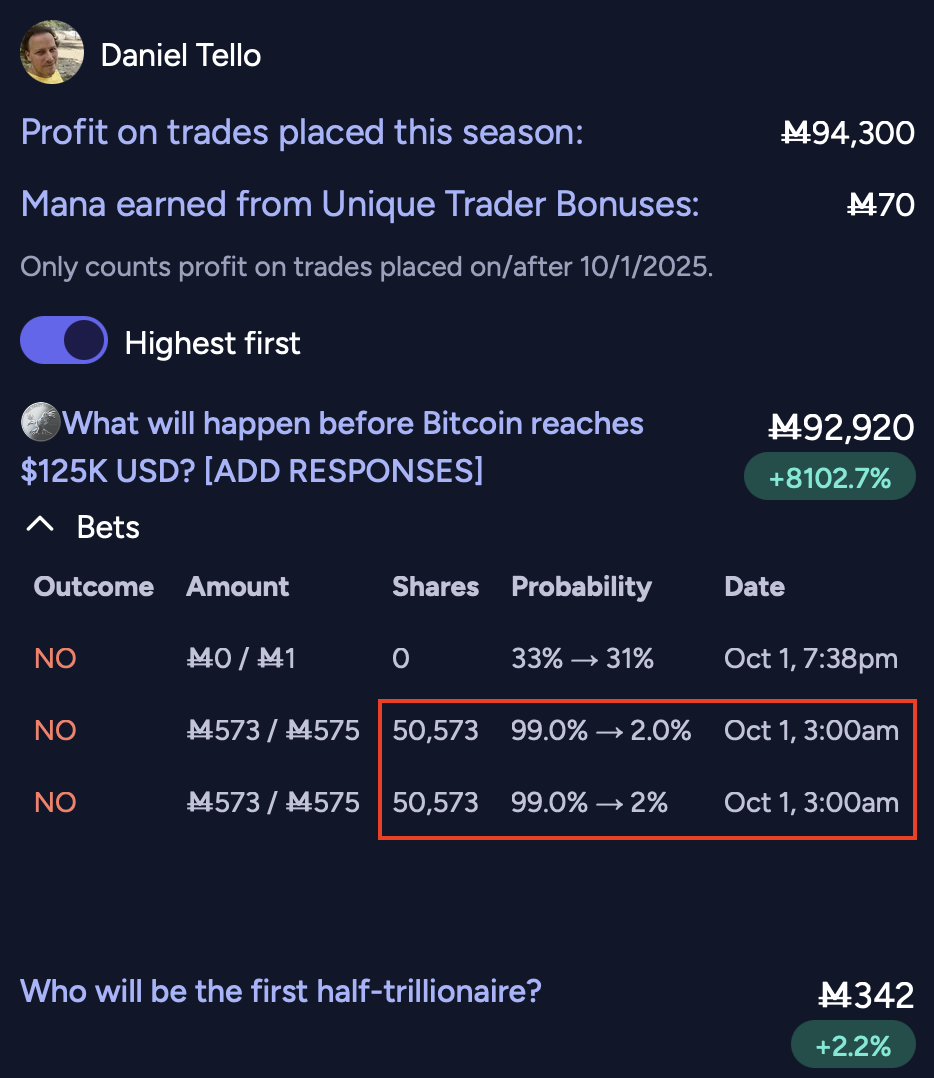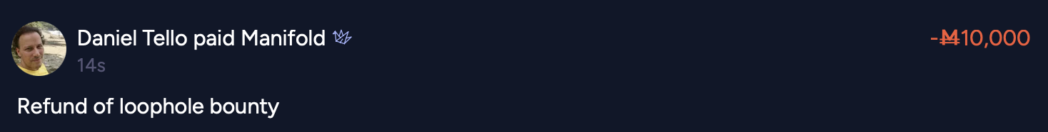 @Chumchulum I think maybe m10k is too large considering that Daniel exploited the bug in prod... I'm not yet of a mind to take it (or some of it) back tho. I found his explanation helpful and the high-effort market a token of good faith, that's mainly what I was thinking when I gave out the bounty. Also it was pretty easy to undo his fake profits.
