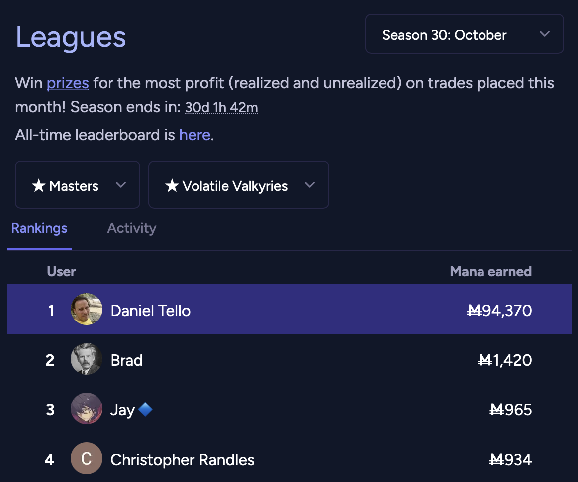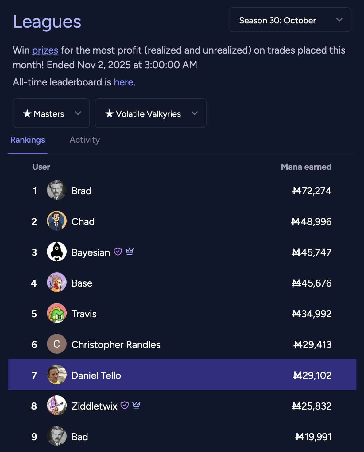I've artificially manufactured almost M93k in fake leagues profits for this new Season 30 (Oct 2025). These are not real profits, I've not gained a single mana through these trades. By trading against my own (no alts, just my own account) limit orders (big and badly priced) placed shortly before the season start, the profit gets recorded when they got filled less than a minute later in the new season. But there must be an offsetting loss on the other leg of the trade, you say correctly, if I'm trading against myself? Well, the loss is carried by my old self at the time of the limit placement a few seconds before the season started, and due to the overlapping random closing season period the closing season has not yet ended, so the profit also gets accounted in that season fully offsetting the limit order losses meaning zero impact in the closing season. The key thing is that the profitable leg gets recorded for both seasons, but the losing one only applies to the old season.