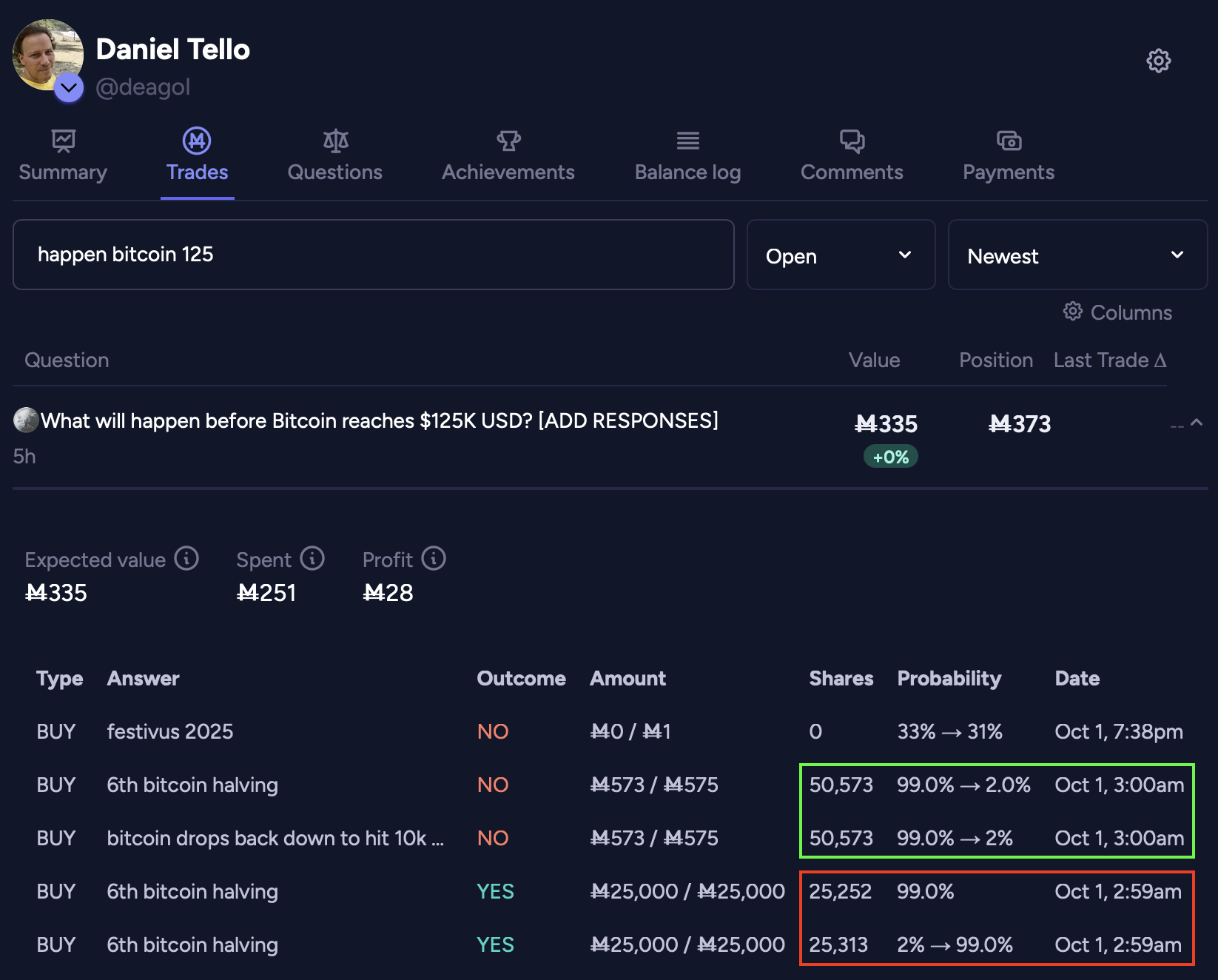 Here's my Trades tab showing the shares bought and sold, the probability swings, and the times bracketing the start of the season (I highlighted the "bad" limits in red and the "good" trades in green):