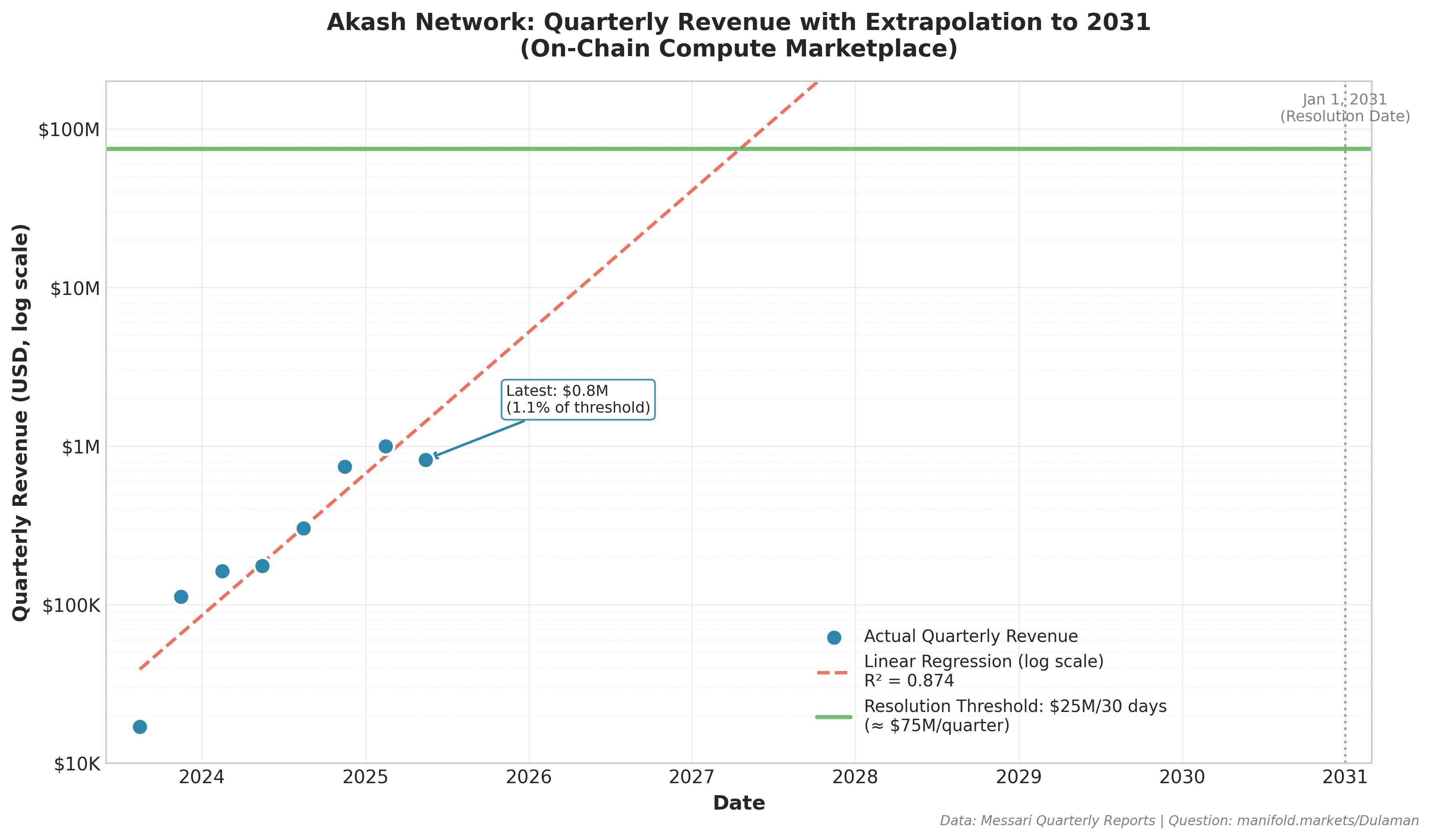Resolves as YES if there is strong evidence that a blockchain‑ (or similar‑technology‑) based decentralized marketplace for buying and selling compute resources achieves “scaled usage” in any 30‑consecutive‑day window ending before January 1, 2031, by meeting at least 3 of the following 5 criteria: