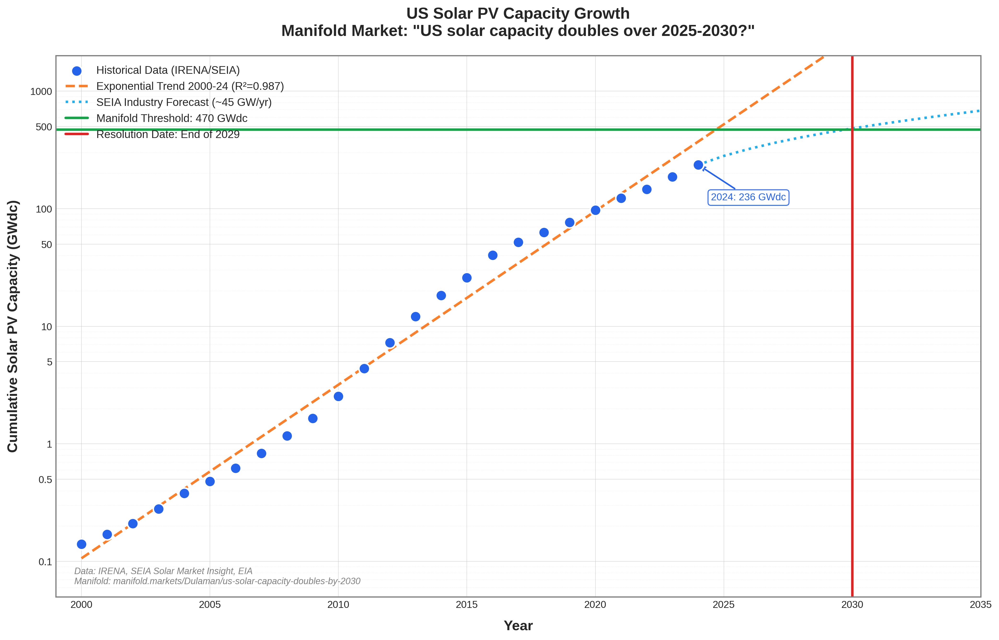 Resolves as YES if there is strong evidence that cumulative installed U.S. solar PV capacity reached at least 470 GWdc before January 1st 2030.