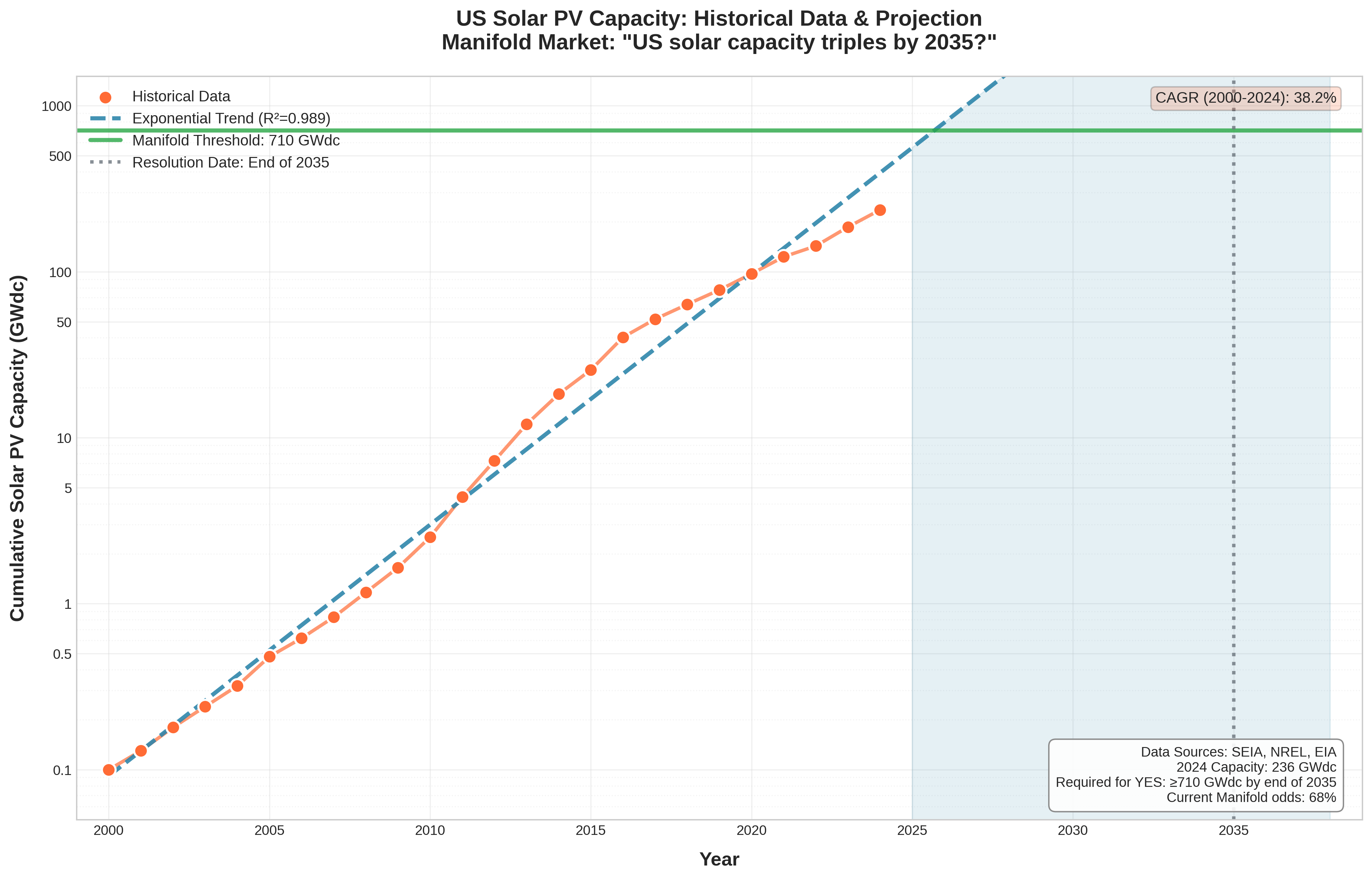 Resolves as YES if there is strong evidence that cumulative installed U.S. solar PV capacity reached at least 710 GWdc before January 1st 2036.