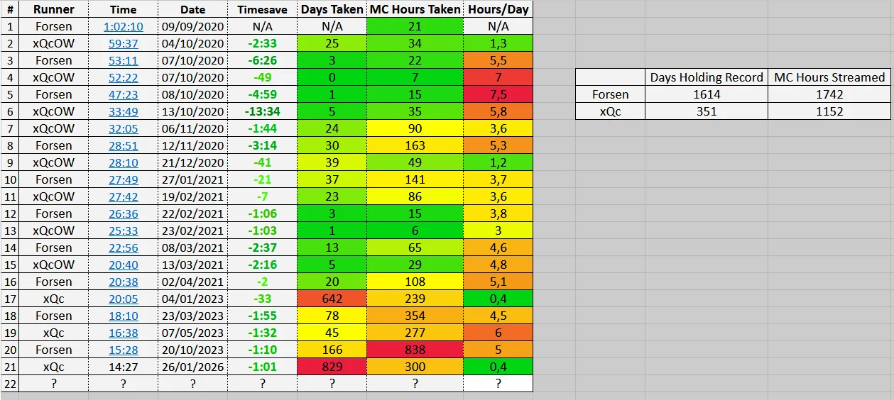 Will Forsen beat xQc's Minecraft speedrun record of 14:27 in 2026?