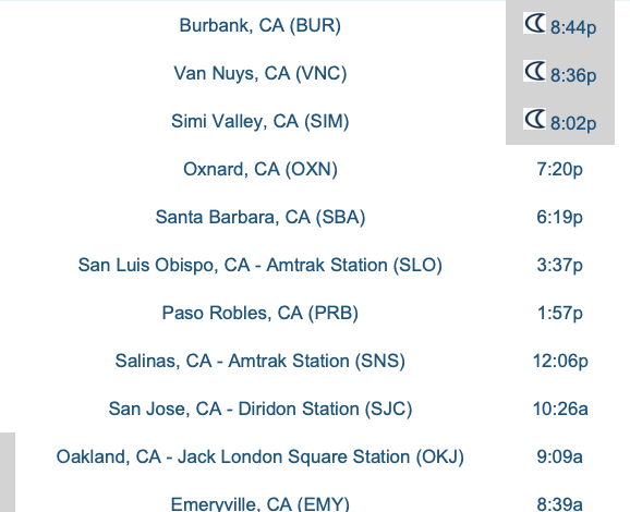 I am currently taking the Amtrak from Emeryville CA to Burbank CA. At time of writing, the train is already 18 minutes late and hasn't departed yet.