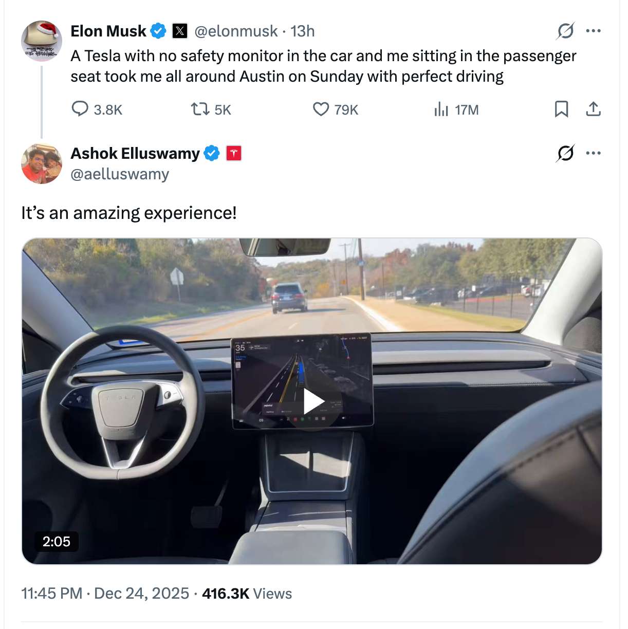 - Tesla is about to remove the safety monitor (already doing rider-only tests with employees in the backseat). This means achieving in 6 months what took Waymo 2.5 years.