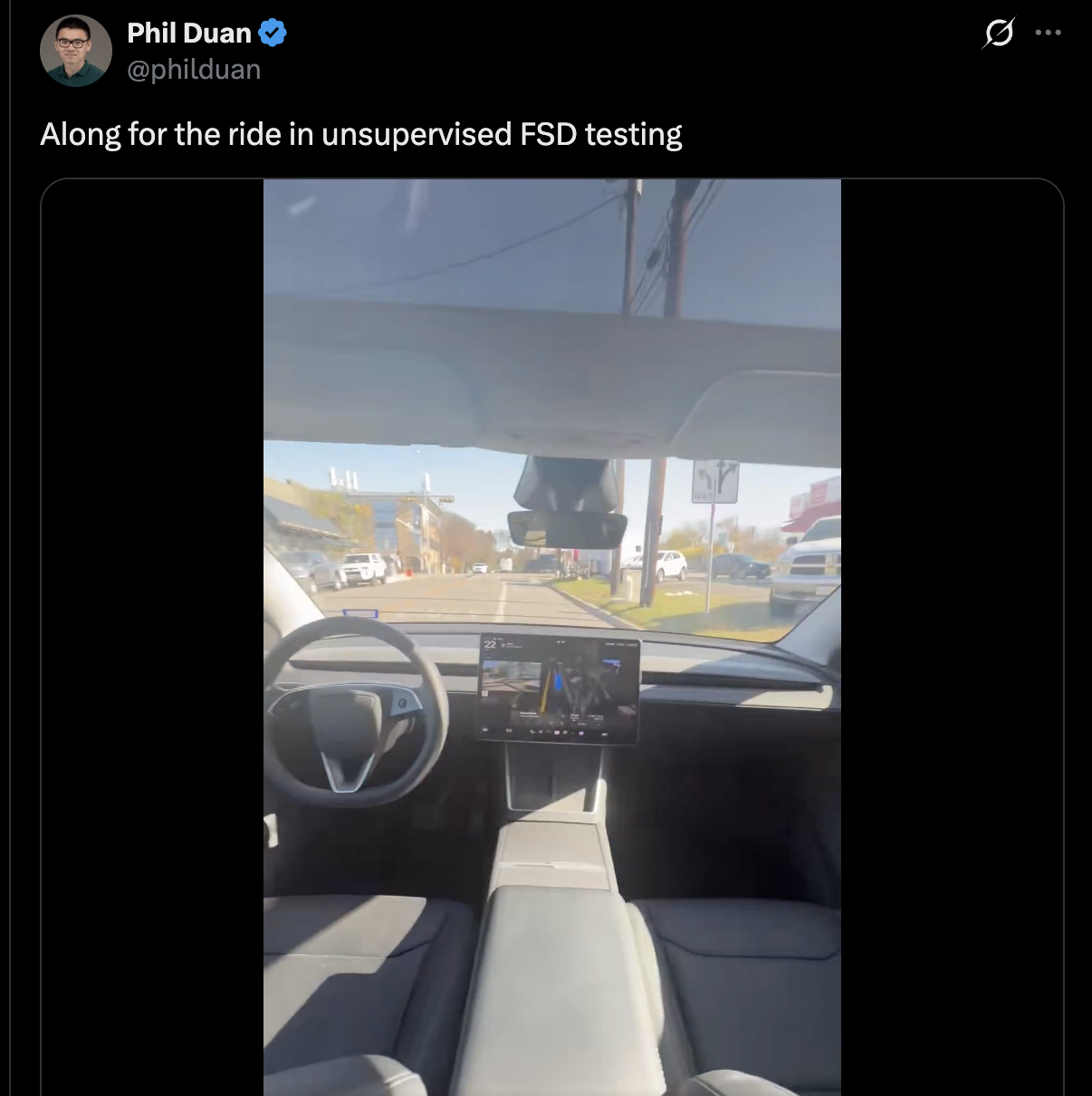 Unsupervised FSD testing now carrying person in the backseat (but a Tesla employee, for now) https://x.com/philduan/status/2002843697273262468