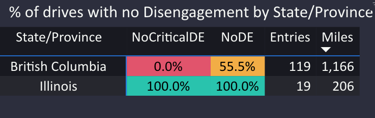 It looks like this is all based on exactly 2 people, one in Illinois and one in British Columbia. I guess version 14 is not rolled out very widely yet. And I can't tell what's up with that 0% and 100% respectively for fraction of drives without critical disengagements. I'm struggling to get a consistent picture of what this data is telling us exactly.