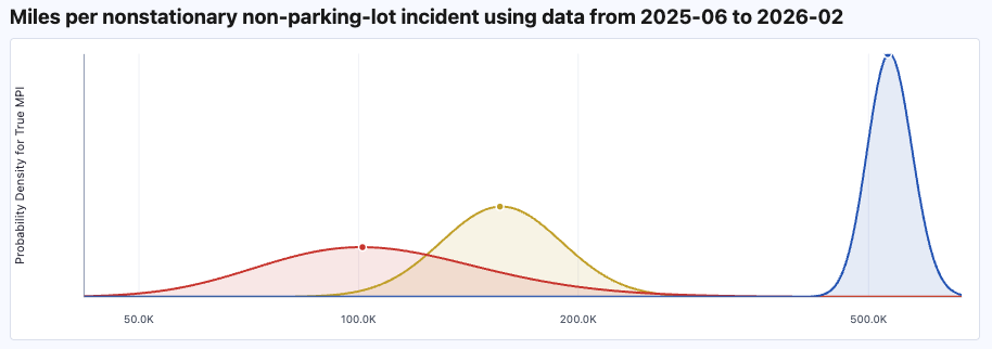 Those guesses, especially the fault percents, are pulled out of my butt. Except the collisions with stationary objects, which are necessarily 100% Tesla's fault. But if we run with those guesses, that's 3.45 at-fault accidents. Over how many miles? More guessing required! I believe that for a while, all Tesla robotaxi rides had an empty driver's seat. But starting in September, Tesla added back driver's-seat safety drivers for rides involving highways. Or more than just those? We have no idea. We do know of cases of Tesla putting the safety driver back when the weather was questionable. In any case, only accidents without a safety driver in the driver's seat are included in this dataset, so we do need to subtract those miles when estimating Tesla's incident rate.