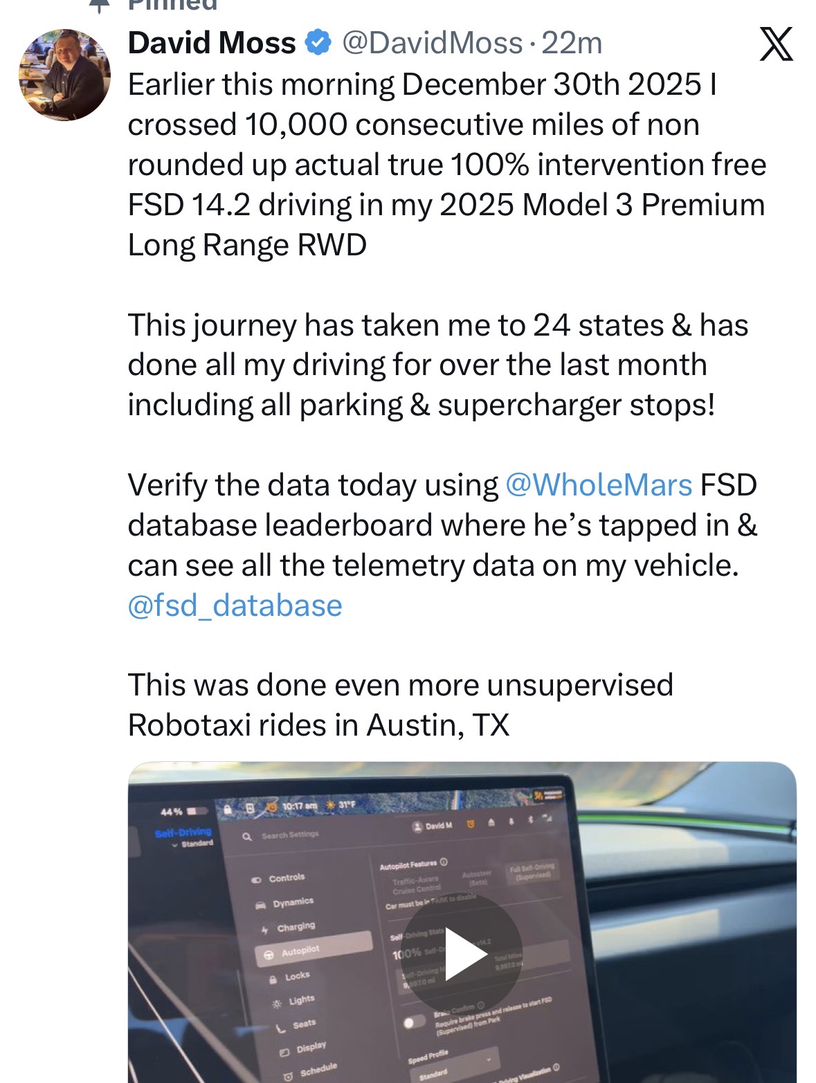 The person who achieved that milestone is up to 11,841 miles with no disengagements as of today: https://fsddb.com/profile/DavidMoss