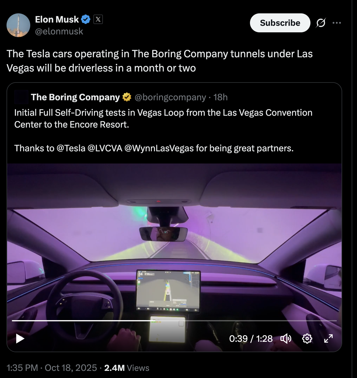 @dreev a) In regard to "focusing on a tunnel": This is one of many areas where Tesla is doing Robotaxi testing. See this tracker https://x.com/jonathanwstokes/status/1978159082419708137 , where multiple cities are being mentioned with related jobs listingσ, and also sightings of test cars on the road