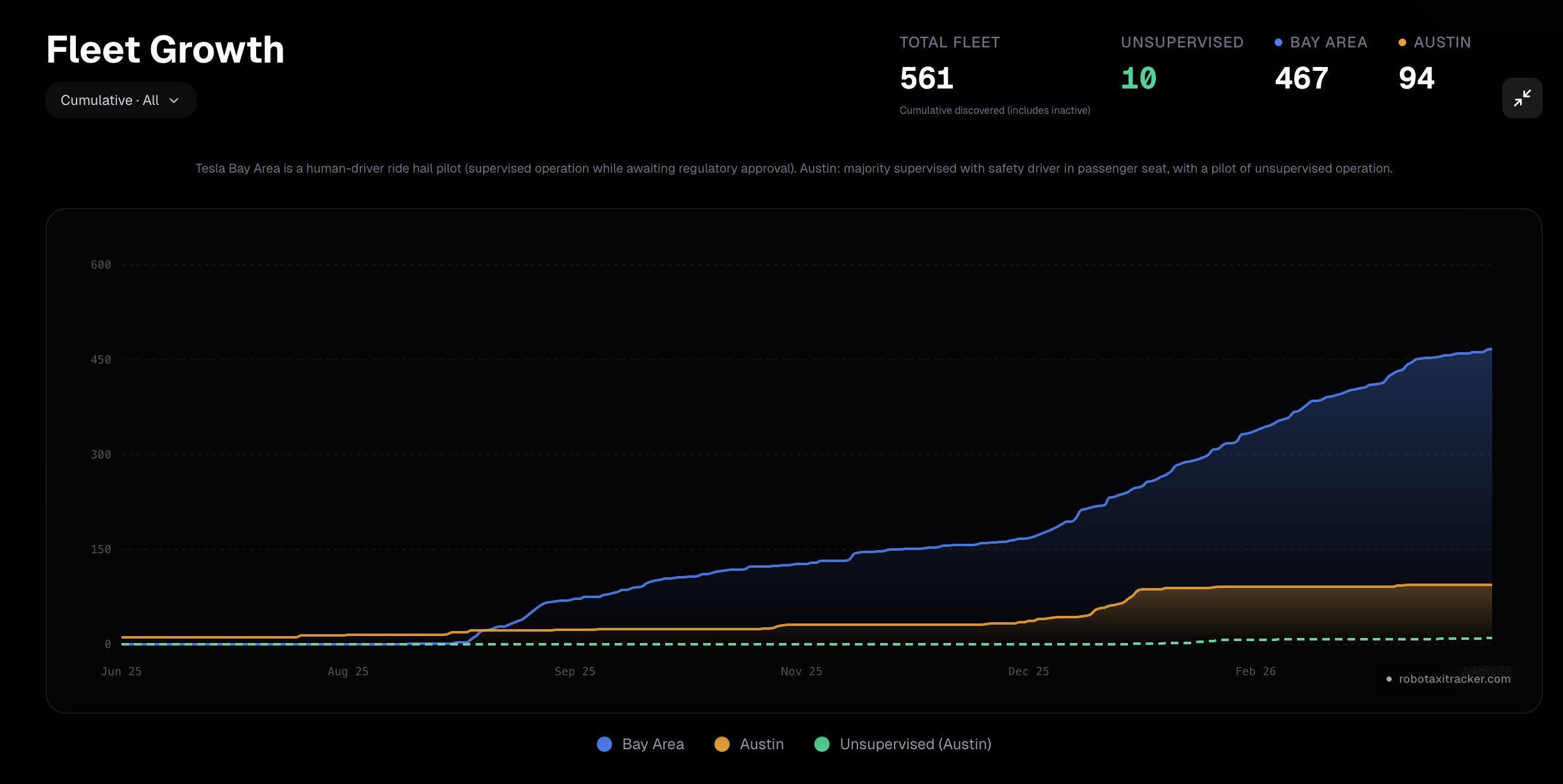 @dreev From what I saw, they take the 650.000 miles chart that Tesla made public in their Q4/2025 investor note as being about Austin only. Probably because the chart says "Robotaxi miles" (Tesla does not use the term Robotaxi in California, see also the Robotaxi page https://www.tesla.com/robotaxi which makes no mention of California)