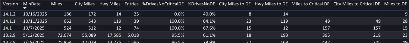 For me v14.1.2 row shows 253 miles, %drivesnocriticalDE as 100%, 10 miles to DE and 5 miles to critical DE.