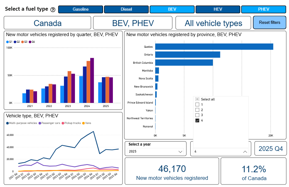 Question will be resolved according to this dashboard: https://www150.statcan.gc.ca/n1/pub/71-607-x/71-607-x2021019-eng.htm, or successor dashboards/Statistics Canada data if the above dashboard no longer works. "Plug in" means battery-electric or plug in hybrid. Will resolve to prob, according to Q4 2025 data.