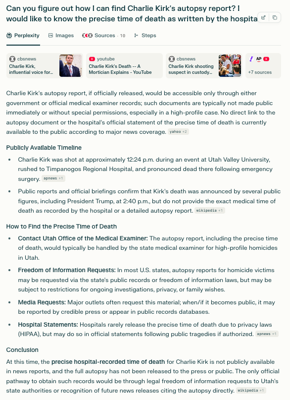 I've been searching "Charlie Kirk Autopsy report" every day since this market was made - there have been no updates at all, and the news cycle has moved on. If we're not going to resolve based on the evidence we have on hand (with multiple sources confirming he made it to the hospital in critical condition (which was past 12:08PM) posted earlier in the comments, I'd prefer that we at least resolve this N/A so I can go reallocate this mana elsewhere. @mods