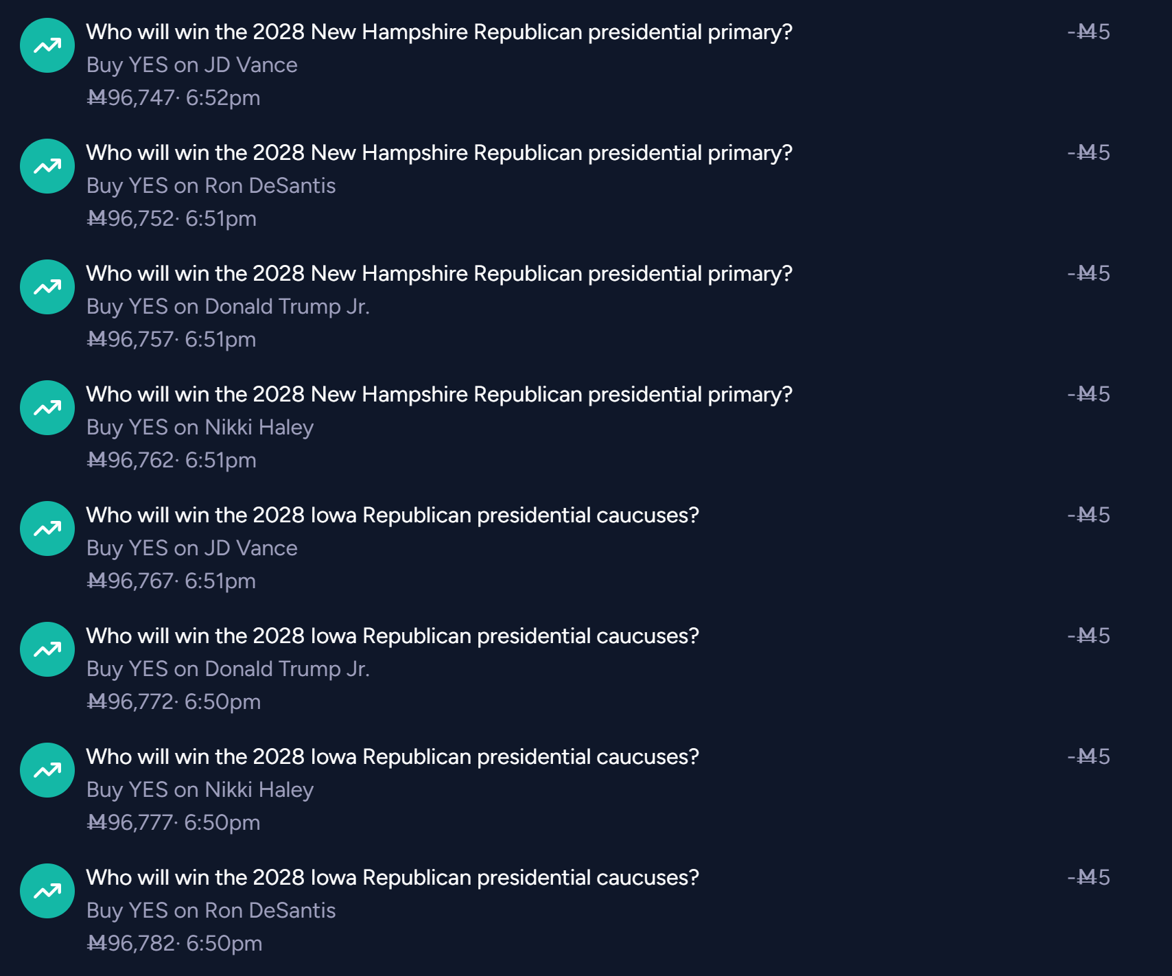 @TheAllMemeingEye With the current trader bonuses, you would have to bet in every one of my markets plus every option in each of my unlinked multiple-choice/numeric markets that you haven't bet on before and even then, the total would still be ~10 mana short. However, if you are still willing to do this, then I will send you the 120 mana.