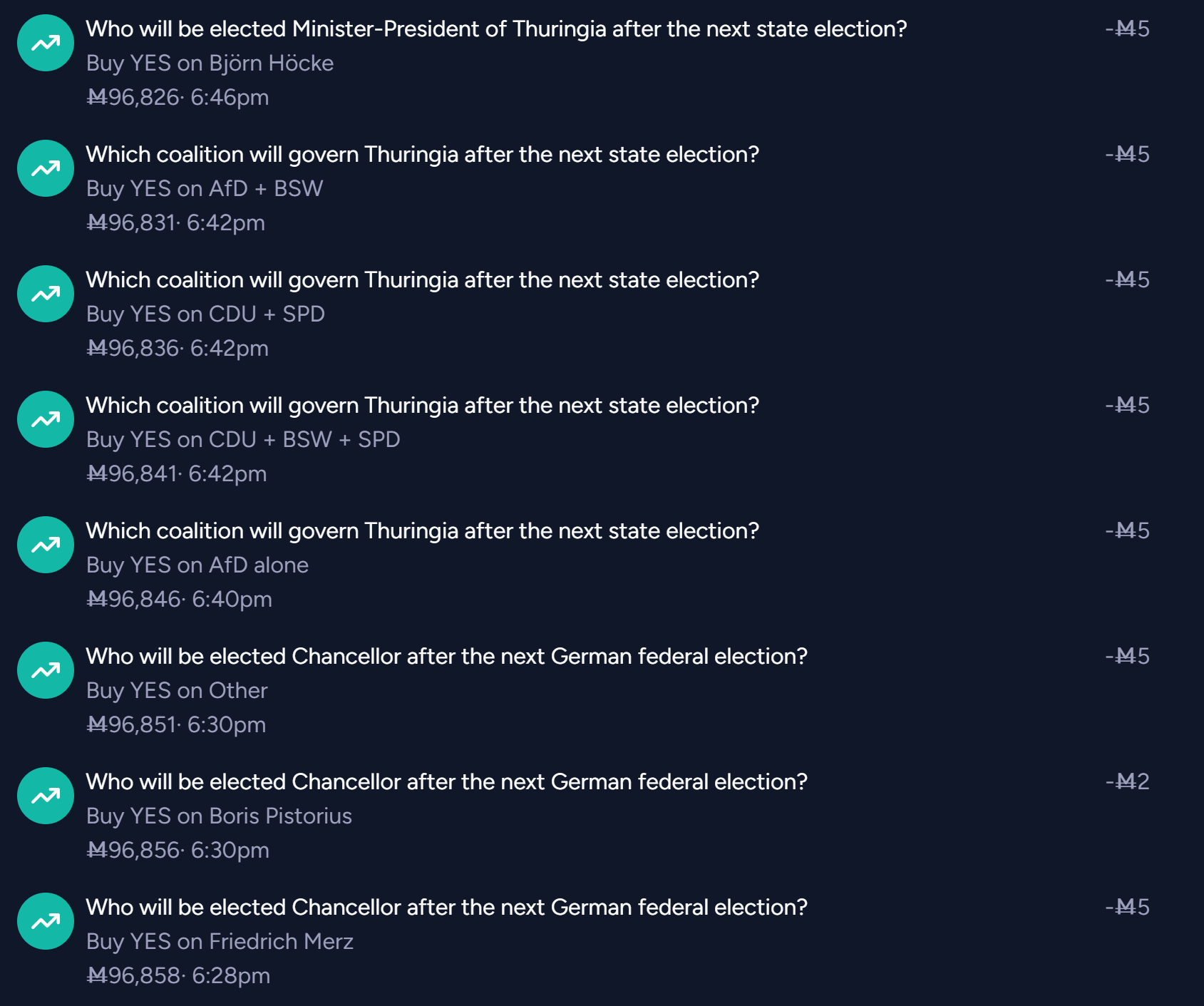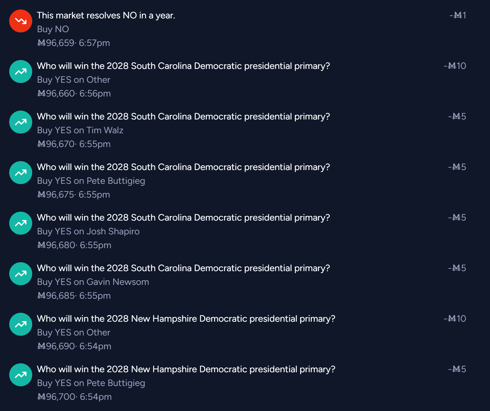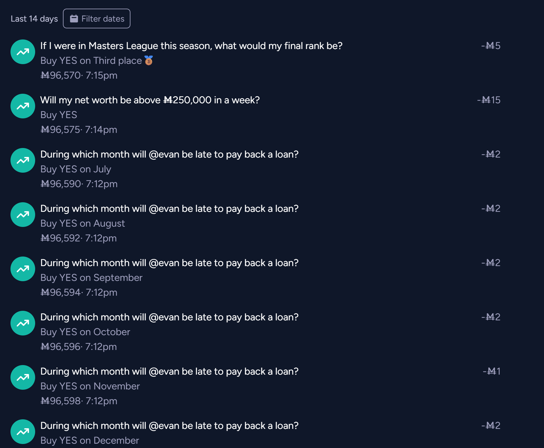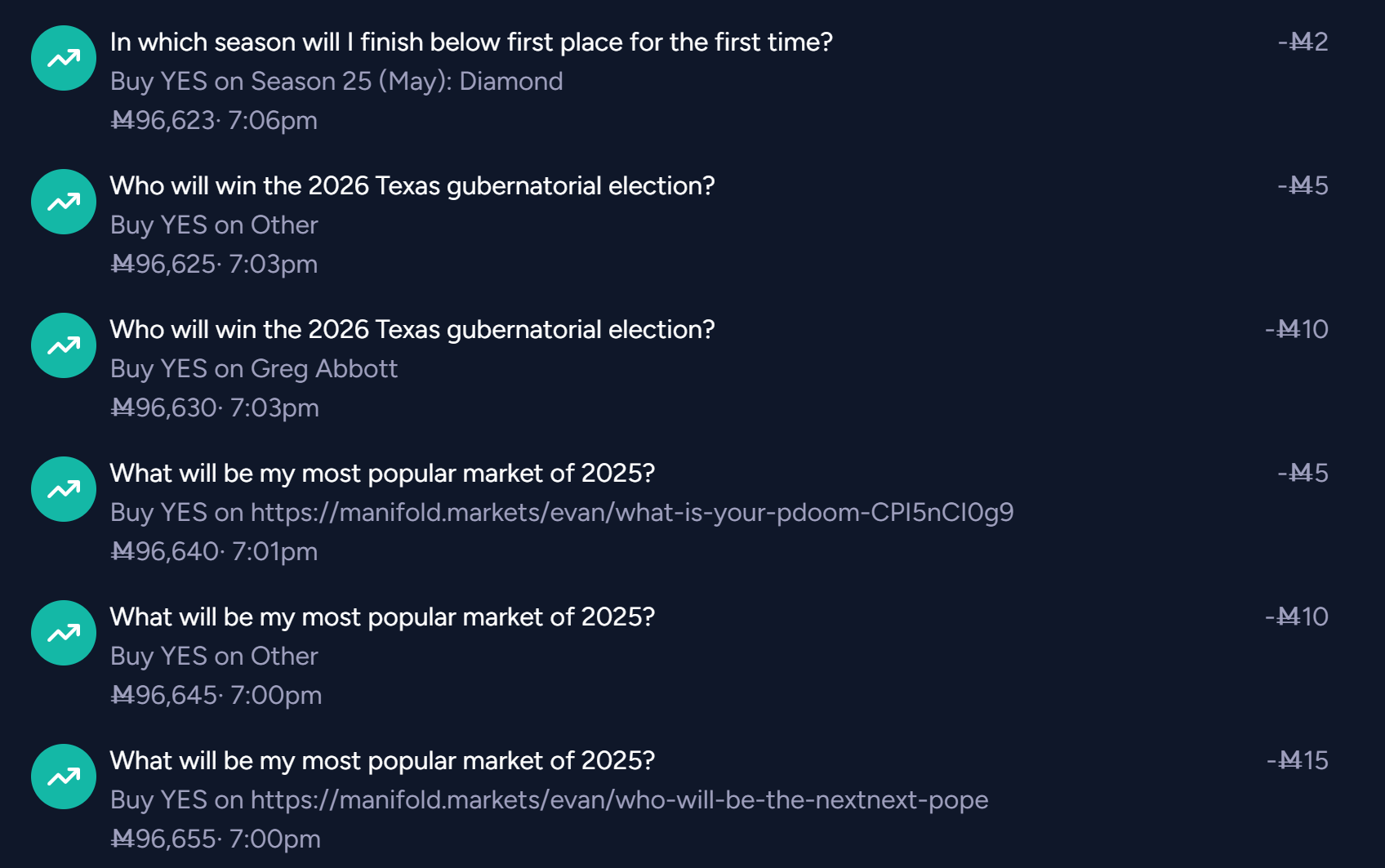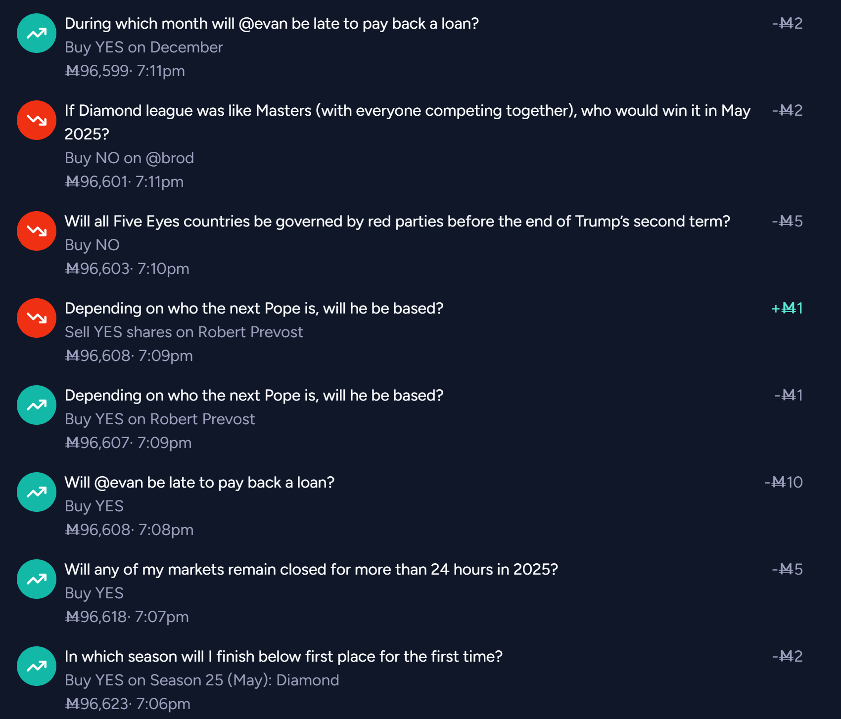 @evan ok, I've slightly calmed down, would you be willing to send me my losses of 120 mana if I generate that mana for you by betting on 12 of your markets that I haven't before? I can even still give you a 5 star rating through my gritted teeth if you take this up