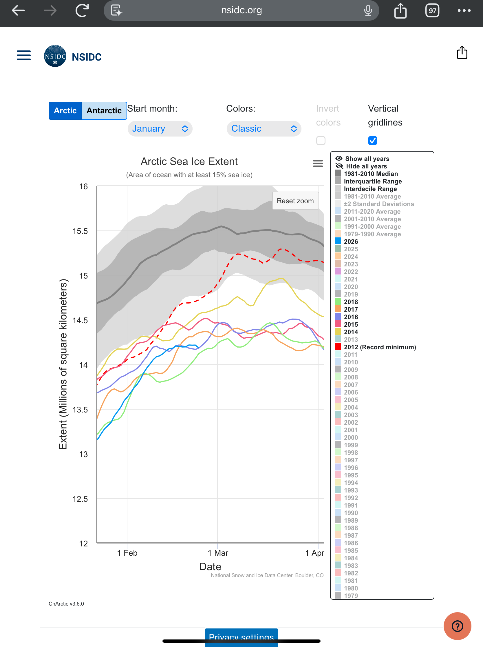I noticed polymarket also now has a related market (but for NSIDC and for the daily max though) (the daily in NSIDC is technically a 5 day trailing mean). It is a different dataset, but at the moment it still seems a contender for the mean low this year even just referencing the daily max market....
