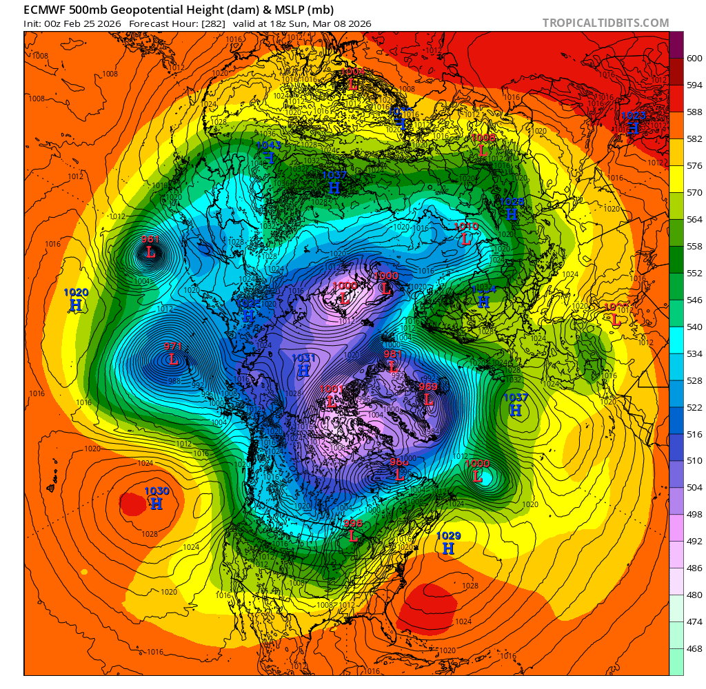 The omega block that has brought above freezing air temps to the Bering Sea should resolve soon after which from the last few ECM det. runs show there won't be further chances to disrupt ice build up in that region until the second week of March. Regardless of how many lows develop in the Pacific it won't mattter if the conditions don't favor them entering the Bering sea under the forecast synoptic setup. The 12Z run yesterday showed them entering whereas today the 00Z run showed them not entering (less meridional flow)