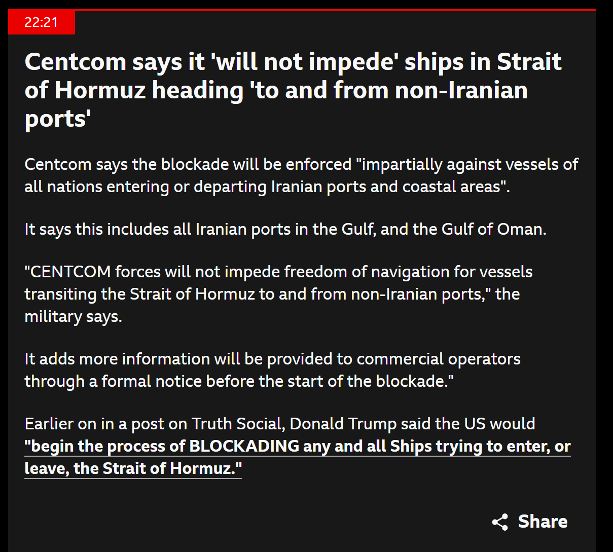 @TheAllMemeingEye ok so now it seems the military itself is claiming it's a much less insane Iran-focused blockade, but the quoted wording from Trump really sounds like it's indiscriminate against the whole strait, this is so bizarre, the bar is on the floor and he still can't reach it