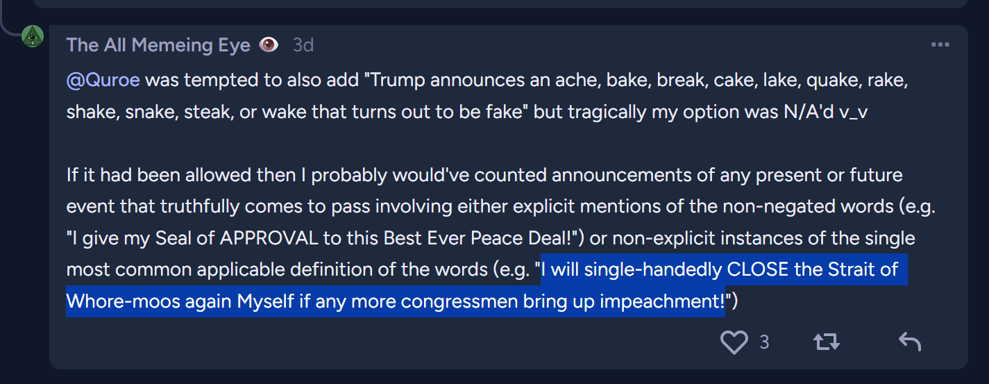 Some disagreements are natural (especially in a situation that keeps developing live and with such a confusing communication from both Iran and Trump) and those disagreements are not a deal-breaker or actually upsetting to me in any way lol. I hope Josh finds a way to manage this market that doesn't drive them insane, but if Josh doesn't wanna do it anymore that fine too ofc. Either way this has been fun so far :)