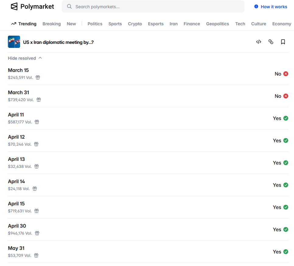 US x Iran permanent peace deal by May 31? [Polymarket]