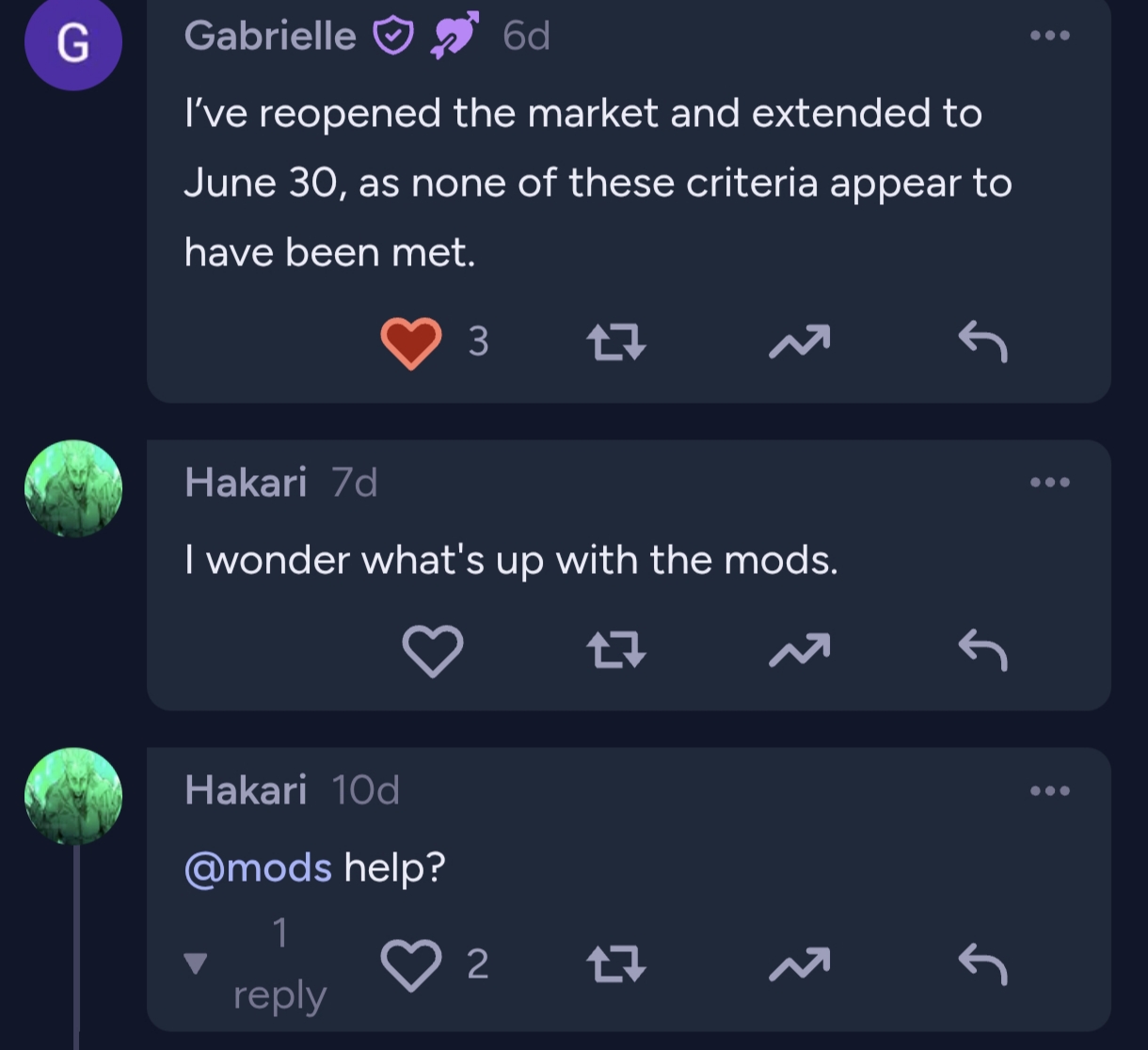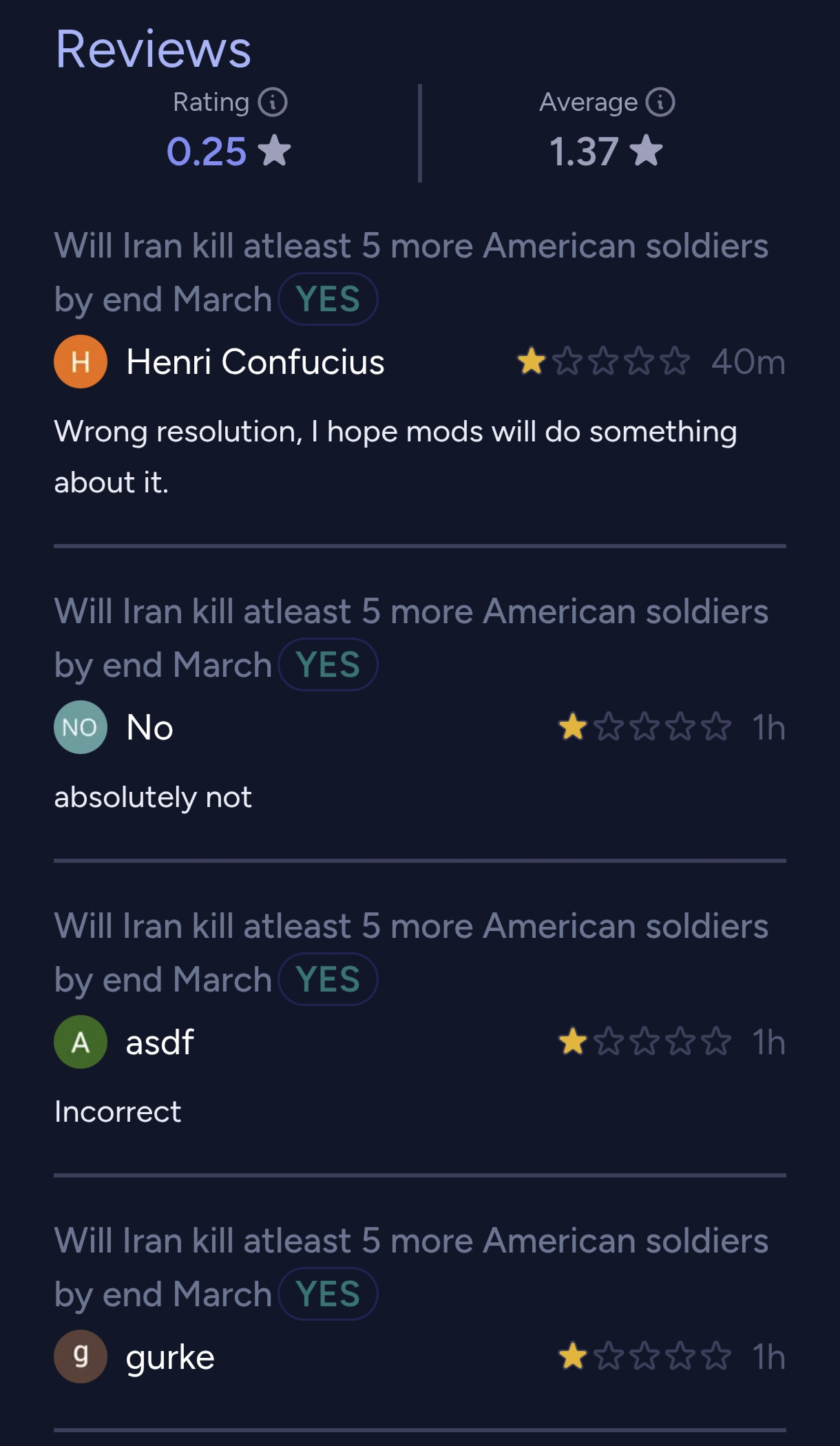Not only were the traders of this market pissed at the resolution, but apparently the market creator has a habit of resolving markete unfairly, given his average score of 0.25 stars and another market that had to be forcefully reopened by an admin
