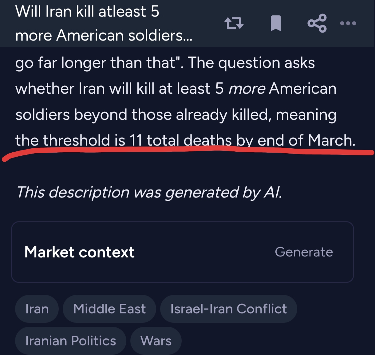 "The question asks whether Iran will kill at least 5 more American soldiers beyond those already killed, meaning the threshold is 11 total deaths by end of March."