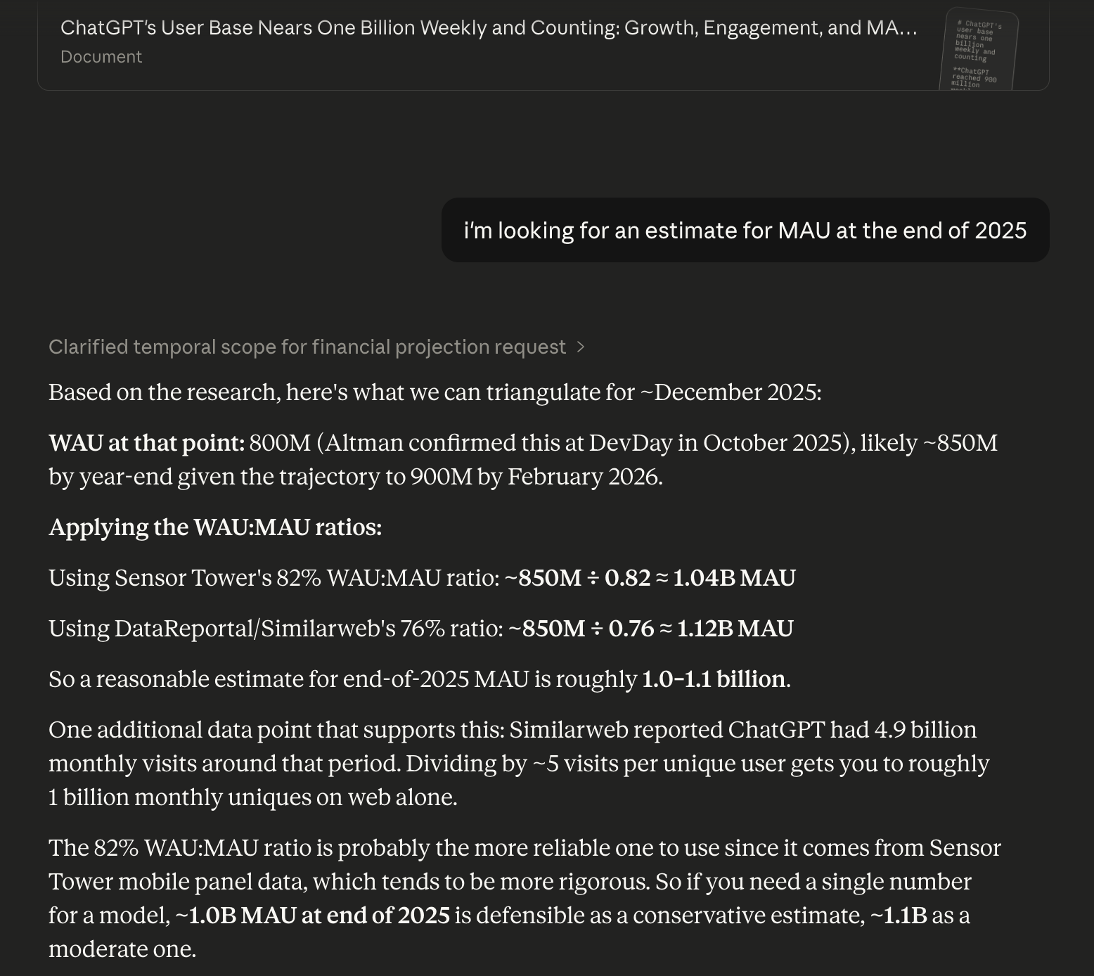 @ShaneBo I've been waiting for more stats on MAU or WAU from openai. Ideally I'd like to see them announce any MAU numbers along with WAU numbers so we can back calculate. If they announce their 1B WAU metric without MAU we can safely assume they're not going to announce their MAU any time soon. If they're not going to release MAUs, all we can do is guess at what it is from the WAU and typical usage patterns from other consumer apps. Those usage patterns typically show larger numbers of MAUs than WAUs. So if our best information says they have 800-900 million WAU as of December 2025, i would bet 200k mana at 80% that they had over 1B MAU.