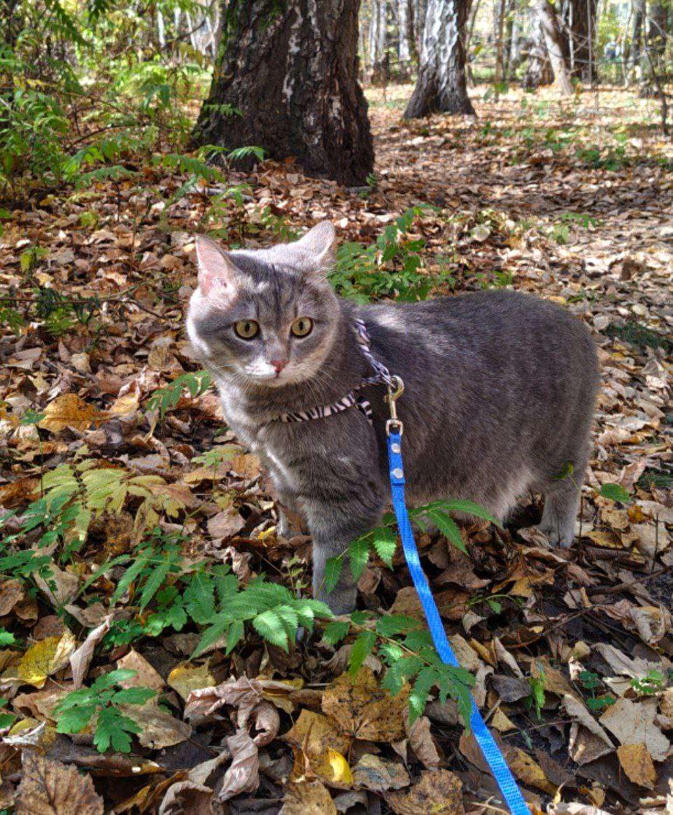 He likes to walk: searches all around, sniffs, tries to hunt. But he doesn't like to be on a leash and he hates when I wash his paws. I give him a piece of food after every washing. There is a small forest with birds, squirrels, mouses, hedgehogs, etc near my flat. The building is kind of inside a forest; there are very old and impressively tall pines, much smaller birches, and other trees whose names I don’t know.