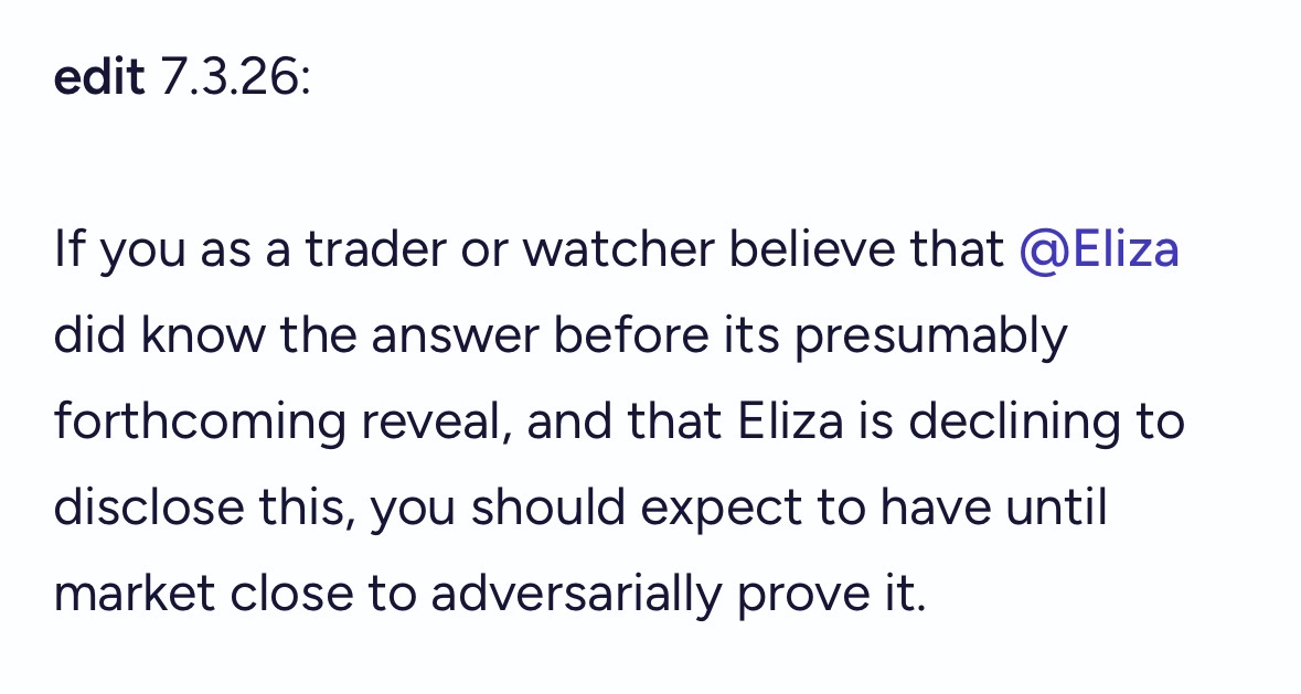 If you as a trader or watcher believe that @Eliza did know the answer before its presumably forthcoming reveal, and that Eliza is declining to disclose this, you should expect to have until market close to adversarially prove it.