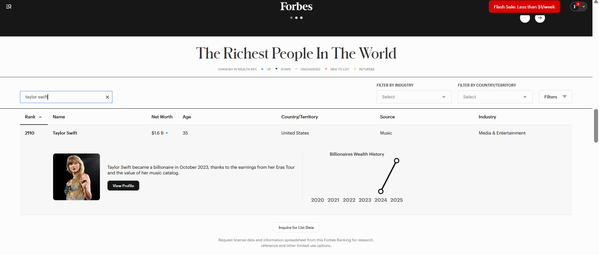 Where will Taylor Swift rank on the Forbes Billionaires List at the end of 2024?