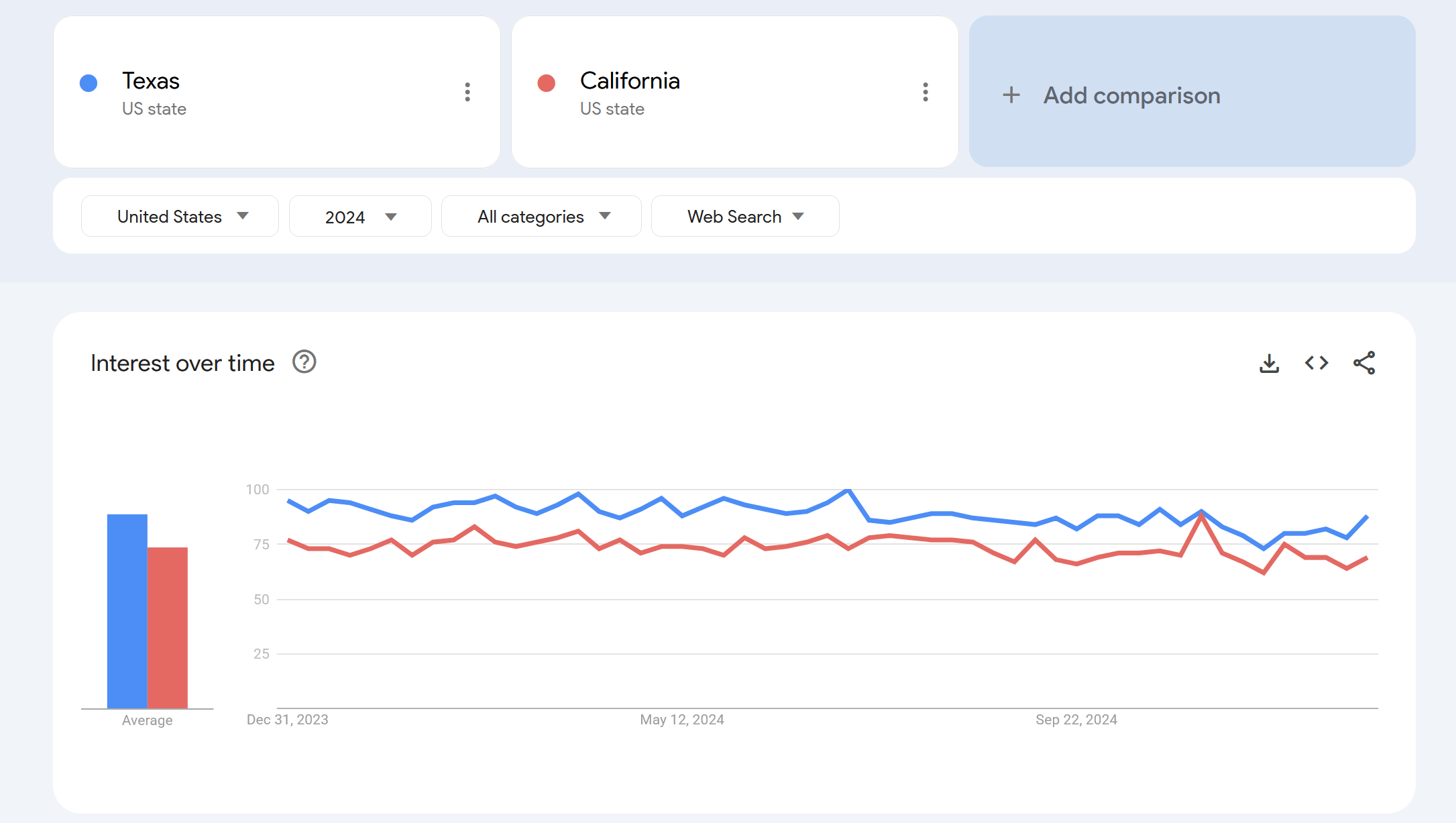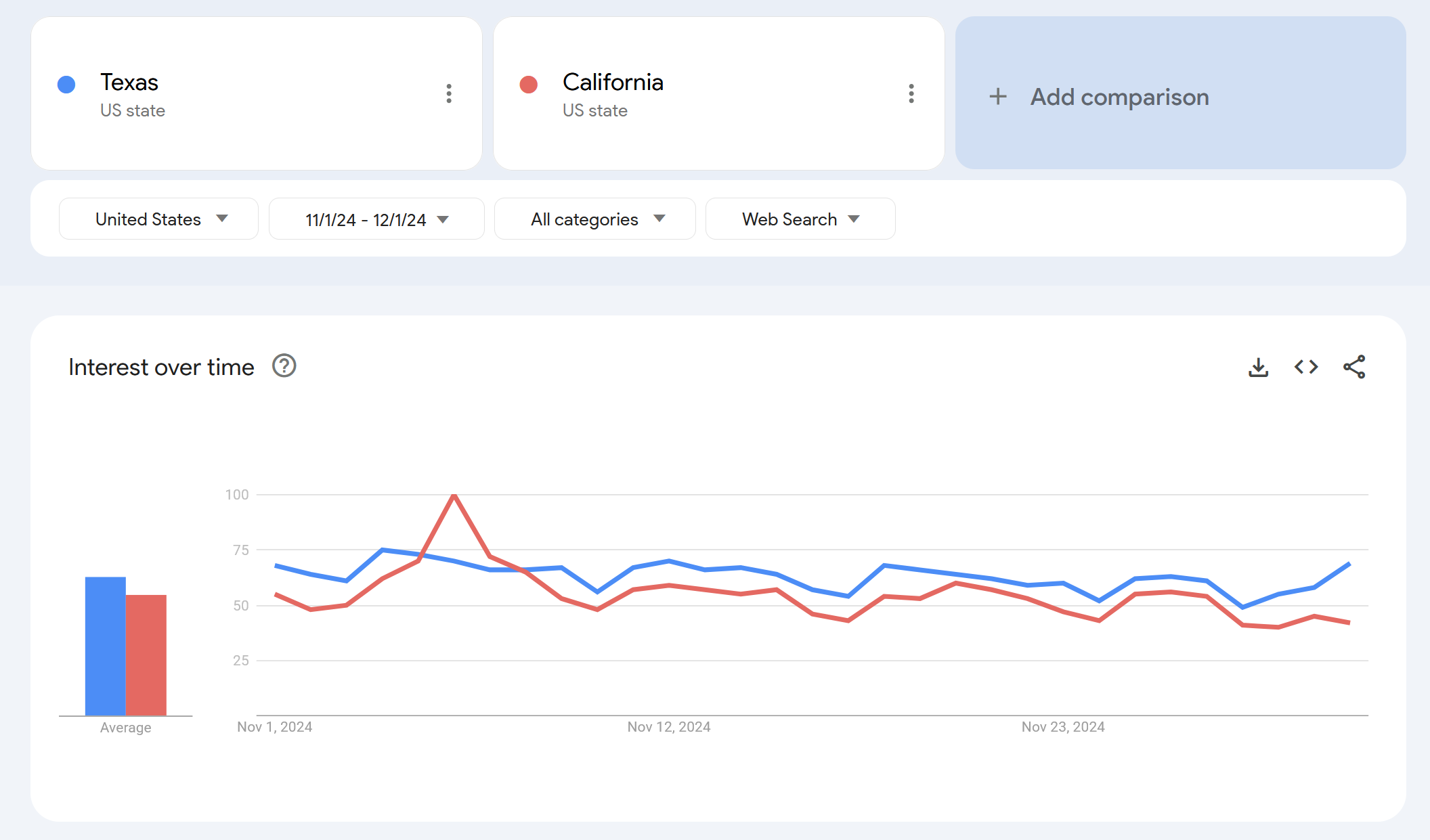 Texas’ Google trend score must be strictly higher (ties Resolve NO) than California every single day of the 30 day chart all year.
