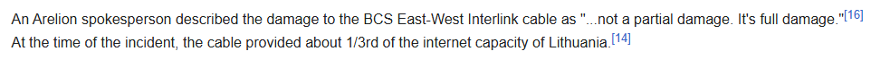 @Panfilo This sounds correct, but I'm unclear on how big the impact was in Lithuania -- does "At the time of the incident, the cable provided about 1/3rd of the internet capacity of Lithuania" mean that speeds and availability was drastically impacted? Mildly? Something in between?