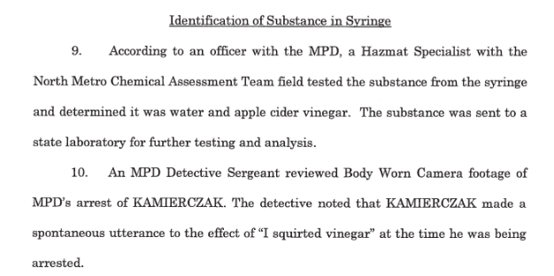 > The criminal complaint noted that the liquid in the syringe was water and apple cider vinegar. Minneapolis police body camera video captured Kazmierczak saying “I squirted vinegar” at the time of his arrest that night.