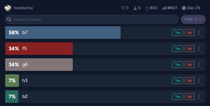 Each day, around 2 PM Pacific time, I will check which square has the highest probability in this market and resolve it, to YES if there is a piece in that square and NO if it's empty. Ties will be resolved alphabetically. If the square is empty, I will repeat with the next highest, then the next, and so on until a piece is revealed. When all options are resolved, I will immediately resolve the sister market. Then I'll post a comment revealing what's in the resolved squares.