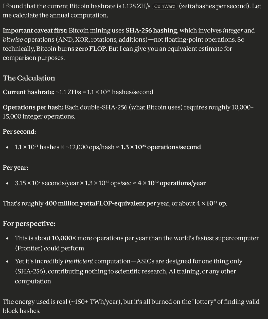 Claude tells me bitcoin network does about 1e32 rough-FLOP-equivalents per year: