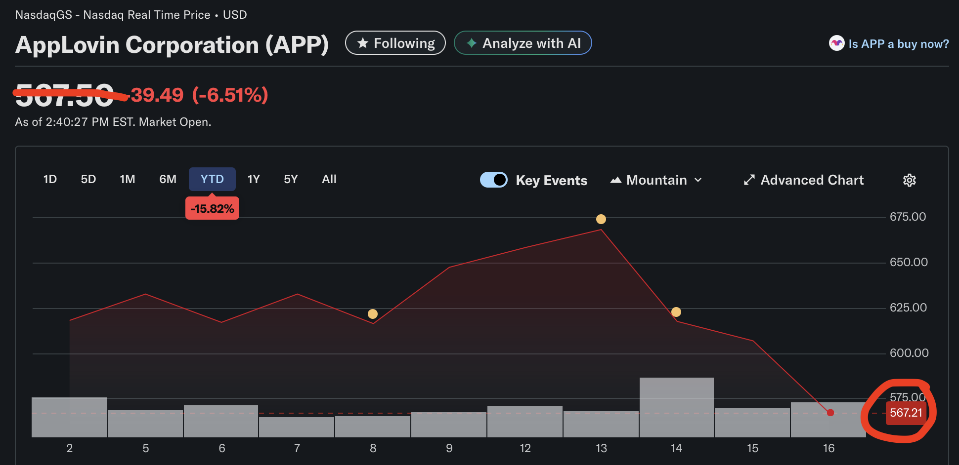 Current price (in chart, realtime price updates w/o updating chart & YTD%): $567.21