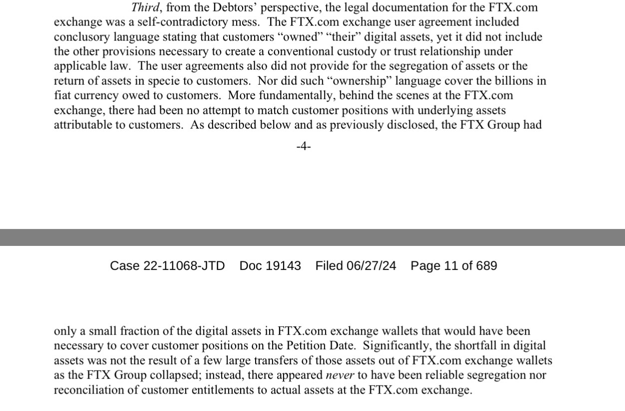 @AndrewHebb there's one specific clause in Terms that some people thought letting Alameda borrow money was violating. In reality, it did not. That part of the terms says just that FTX does not own users’ assets. And now we know there's no applicable law that says that you can't make loans with assets owned by their users: according to John Ray III, FTX intentionally wrote the FTX.com user agreement in a way that would allow them to do it (even though they knew what is the industry practice, and in jurisdictions with tighter requirements FTX, indeed, had user agreements that indeed prohibited loaning user assets).