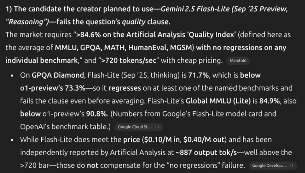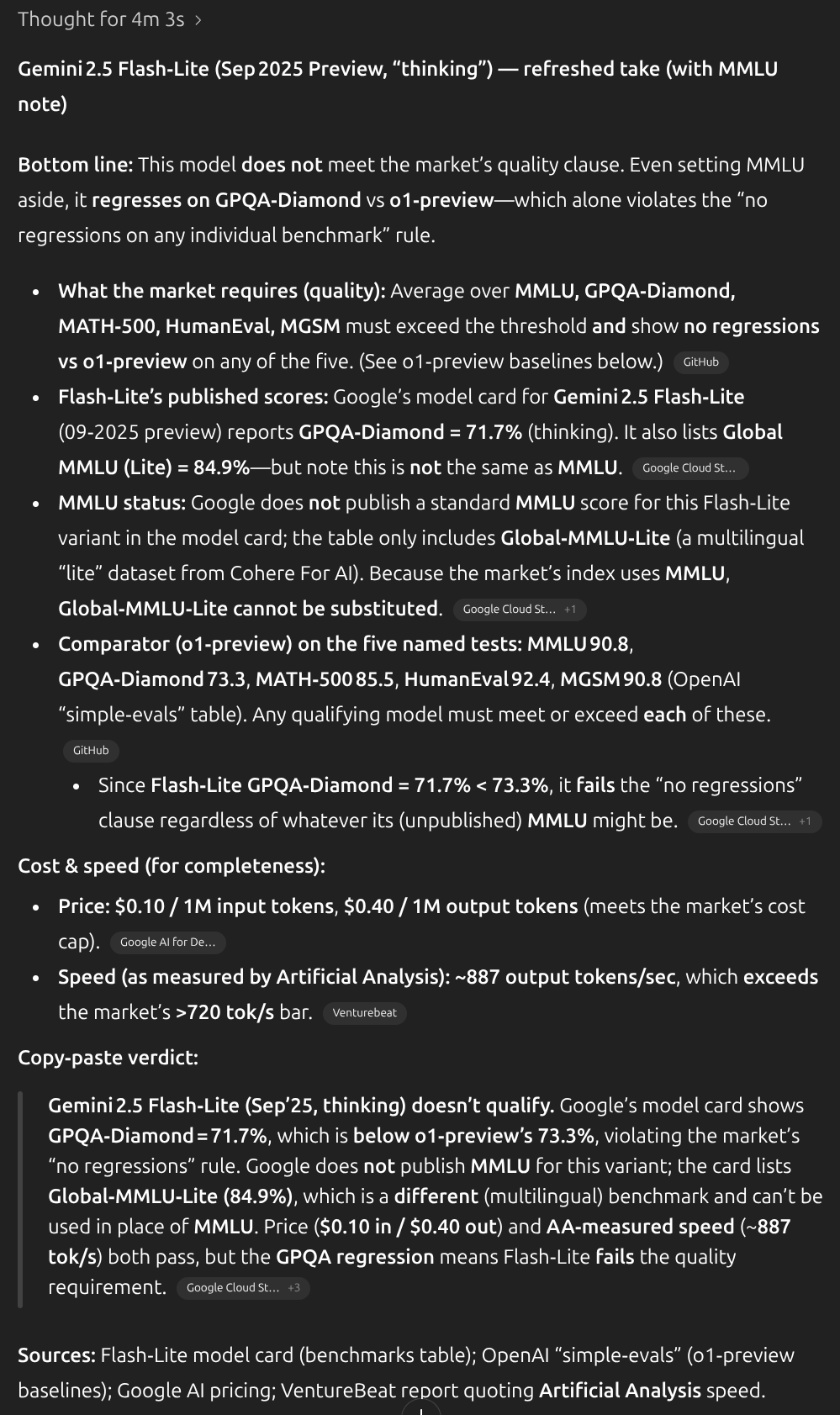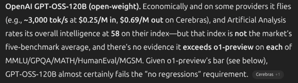 @Dulaman I think there is enough direct and/or circumstantial evidence that GPT-OSS-120B sufficiently clears the criteria (I'd initially overlooked it because I didn't know there were providers that were sufficiently fast); it's not the creator's fault the question was asked when the landscape was completely different so that models released closer to the market's deadline aren't tested on the exact same benchmarks. This probably needs more discussion, though. (I sold my positions before the market was locked so I don't have a stake in this no matter how it resolves anymore.)