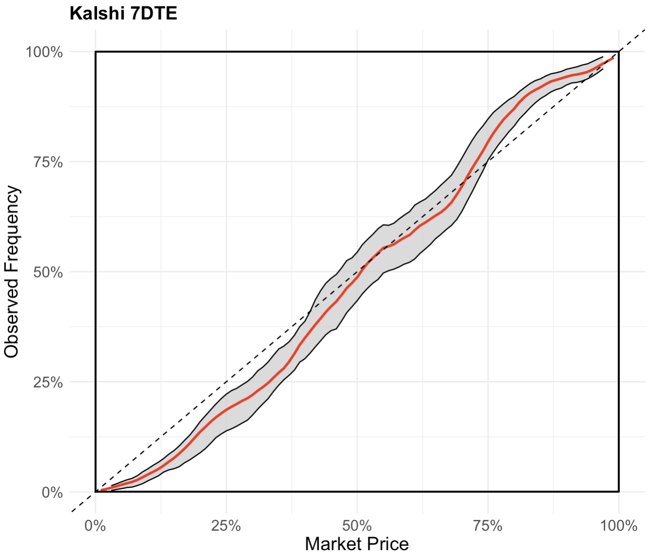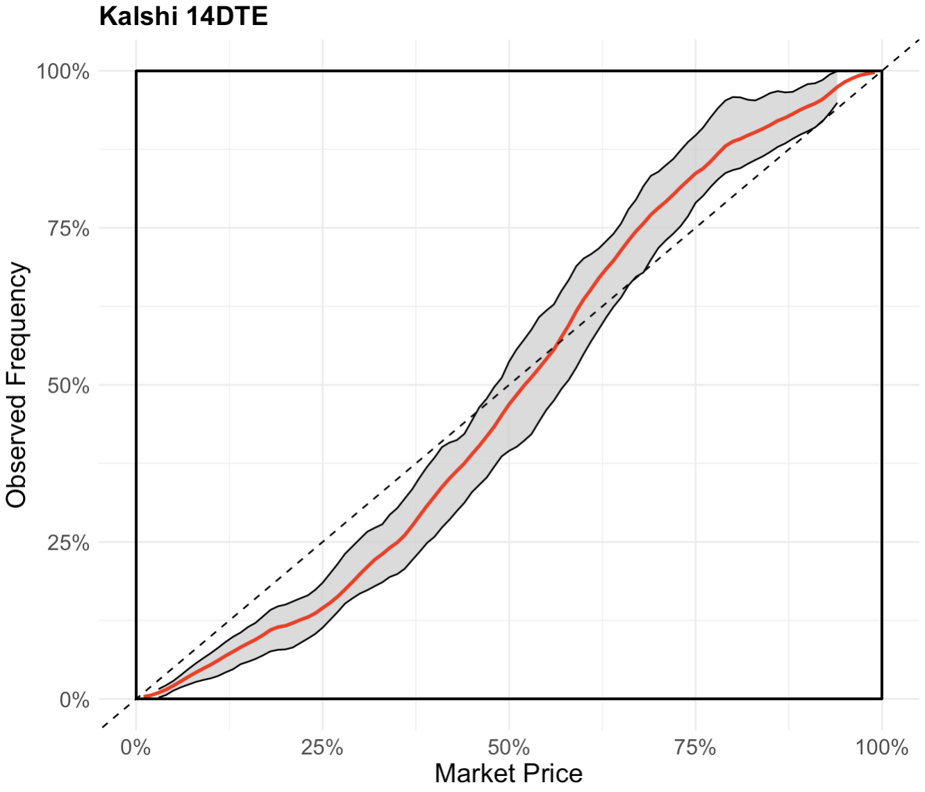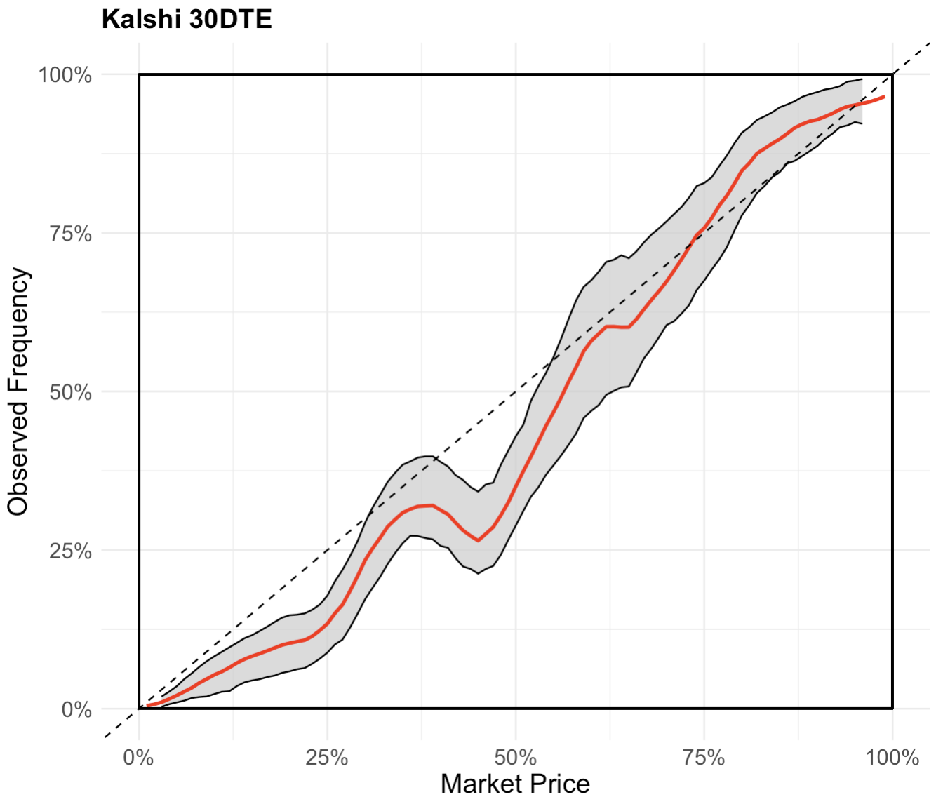 @realDonaldTrump okay this decreases my confidence a lot. NFA, but I think Kalshi does tend to overprice longshots quite considerably. I did some analysis of this for my thesis, here's Kalshi's calibration curve at 7, 14, and 30 days to expiry: