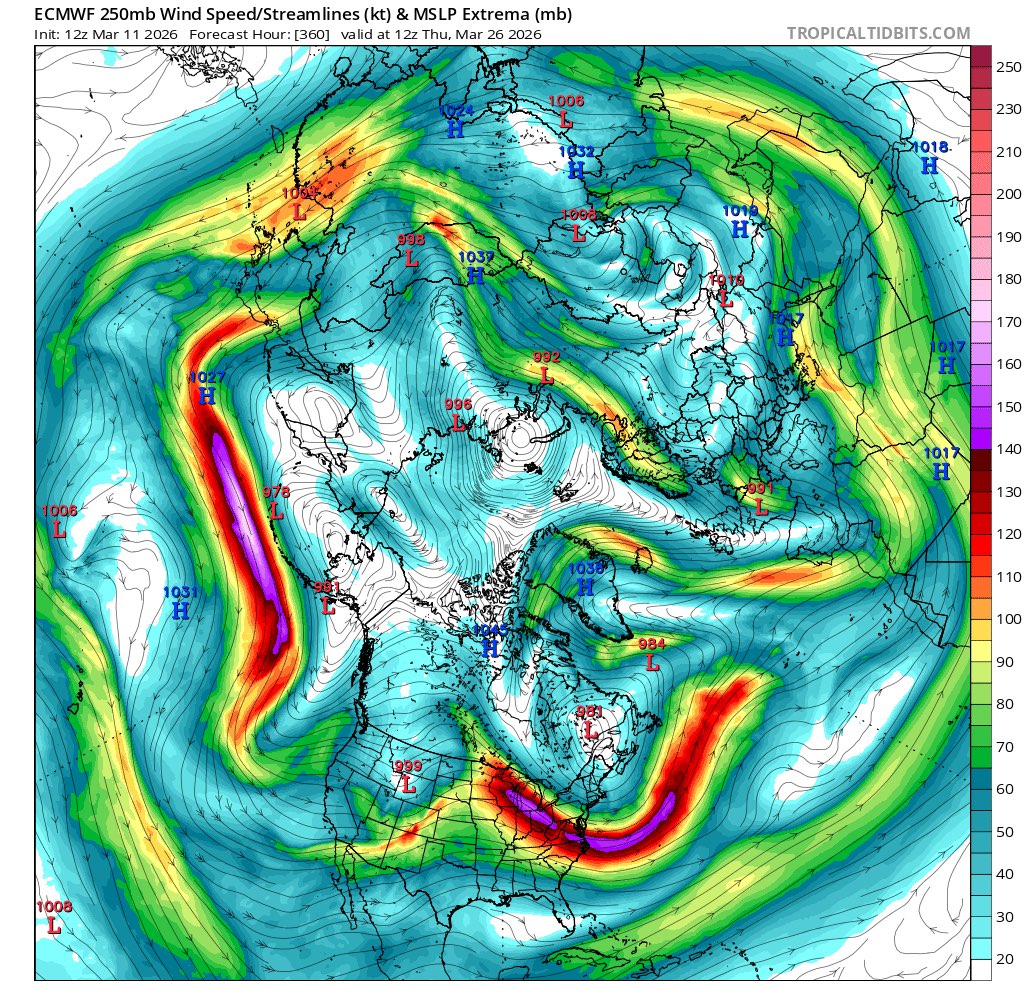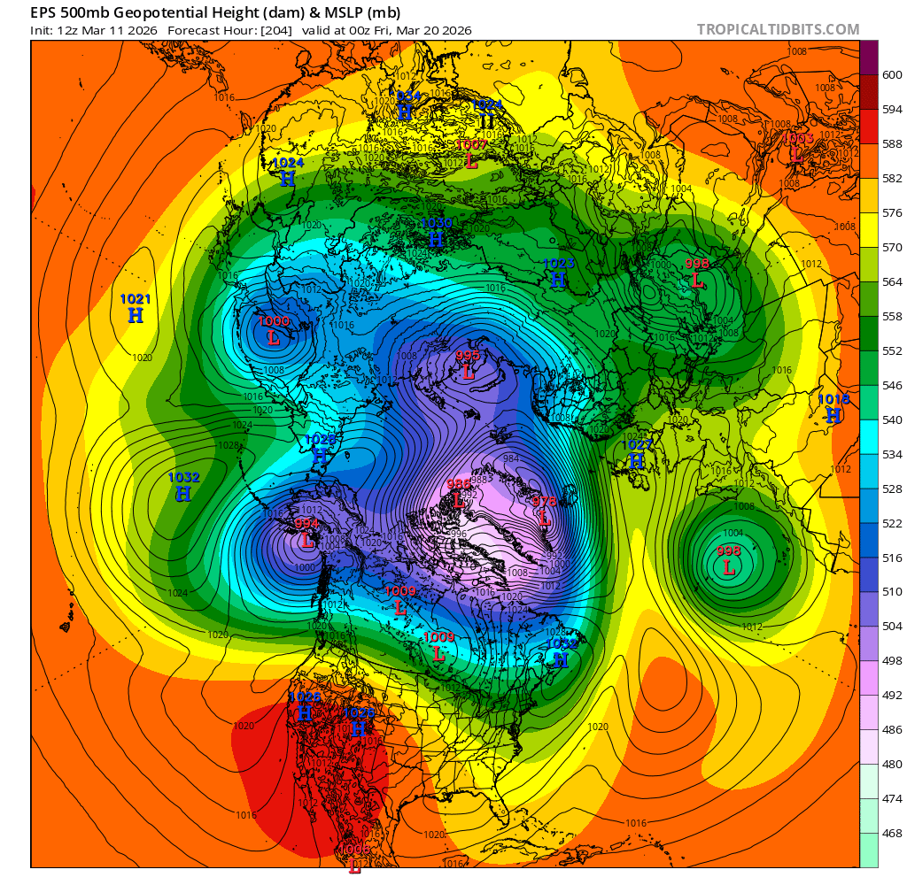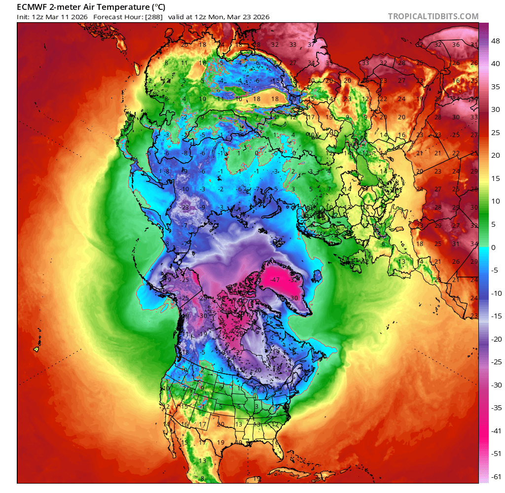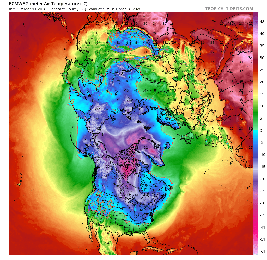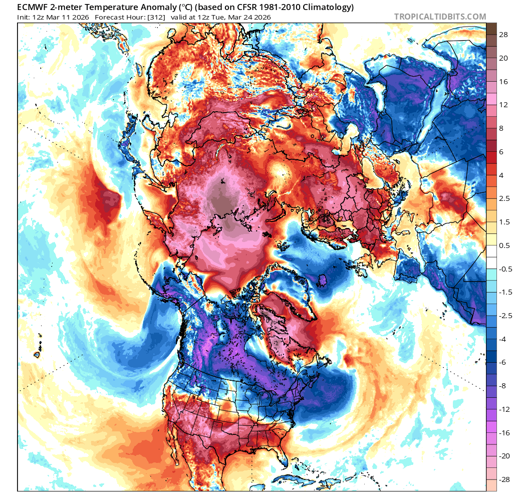 Snowfall in week 2 looks also to inhibit further sea ice buildup in the Labrador Sea (assuming that the PV splits and the lows near there develop so, so this is a bit lower confidence).