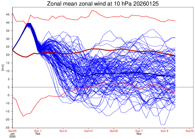 I think its still too far out to say whether we will get a polar vortex split from the medium range models, but if the rough timing from the last few runs verifies we will probably start to see a resulting plateau in the end of February .... (probably a trend similar to 2025 then but delayed a week ?). Though, there should be a bit more confidence in predicting it this time given how stretched it is already (at the very least it looks like a pair of anticyclones develop from the upper stratosphere downwards this time) ...