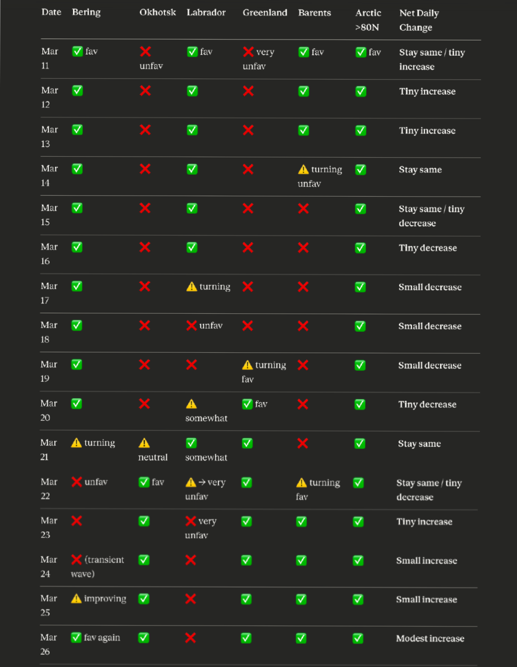 After writing the above i had Claude stitch together the summary in a table.. it looks ok but I think the 23rd and 24th might be net decrease given the rate of loss in the Labrador Sea and possibly we might see actual net gains afterwards if the rate of loss decreases and the Barents Sea has substantial gains.
