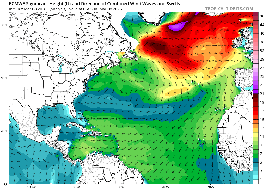 Although there is some snow I think its less of a factor that I thought previously (as advancement should matter more since there is not enough time left), but the conditions look mixed until 10-15 days from now in the Labrador Sea where the waves become less disturbed and there is more steady Northerlies.