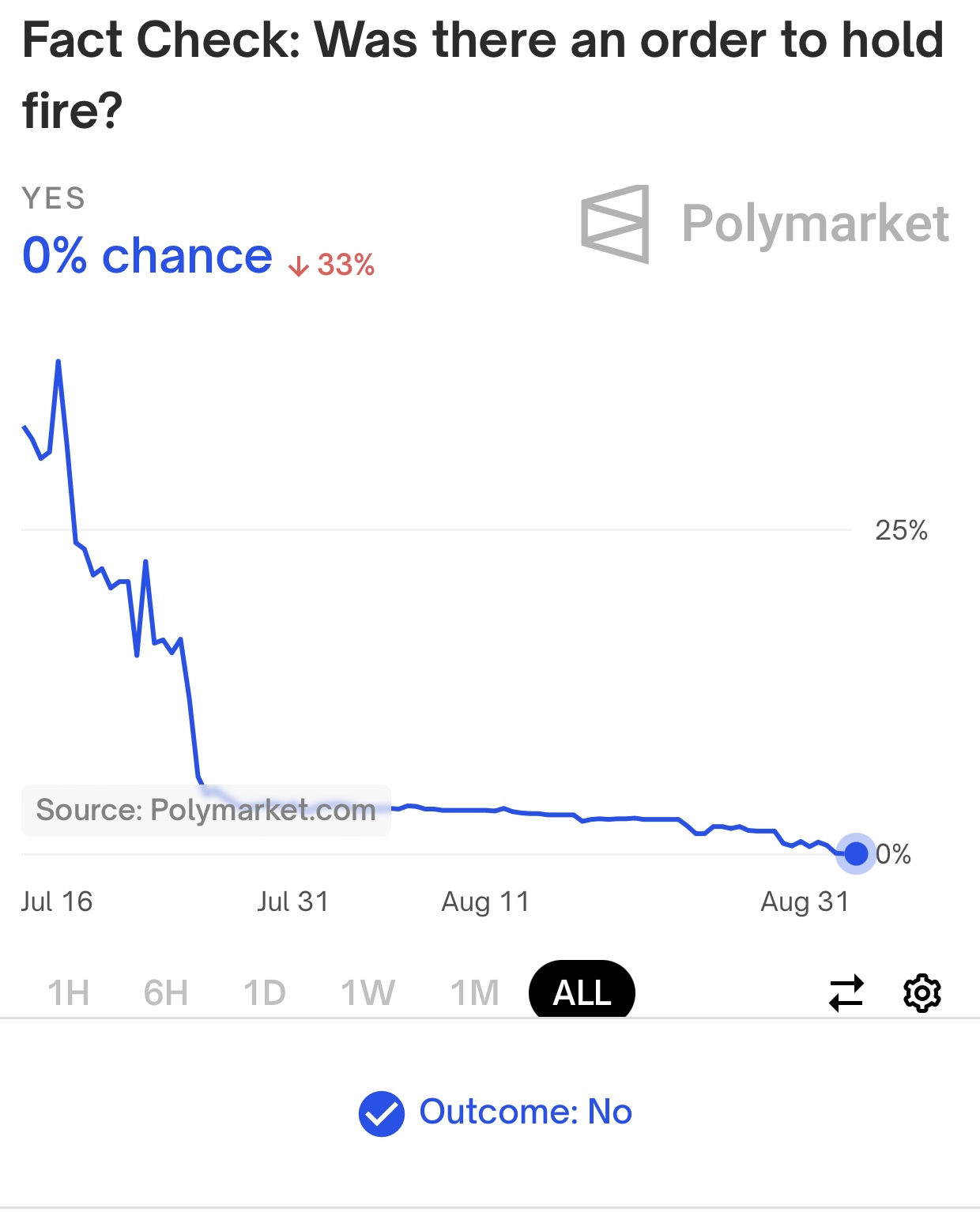 NOTE: i do not think a standard policy to hold fire would be sufficient for a yes resolution. if the polymarket question resolves yes only based on the standard hold fire policy but NO verbal order in the moments after a threat is discovered then i will resolve this as no.