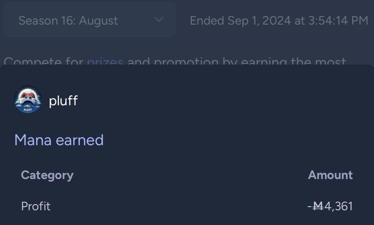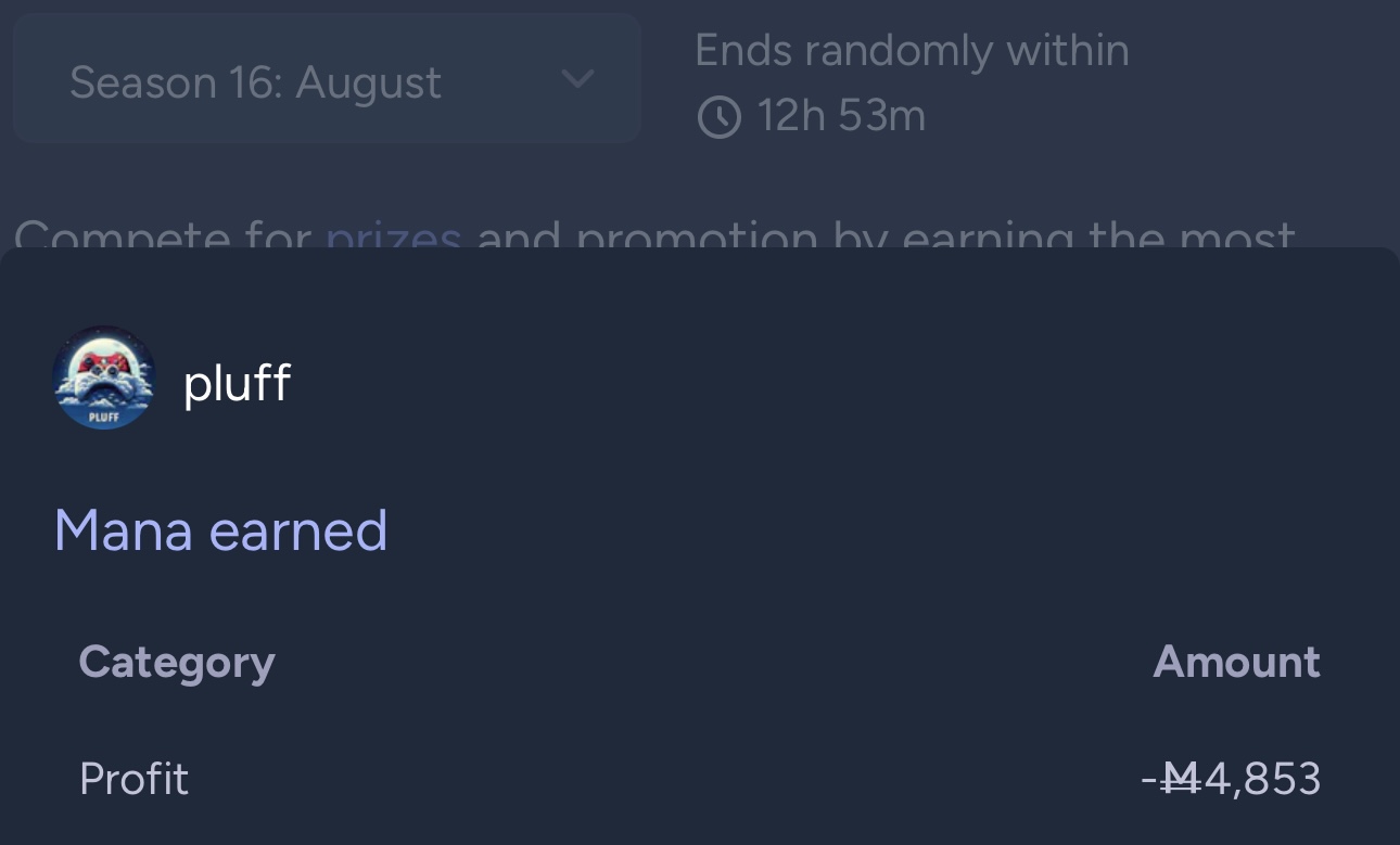 To resolve "One Negative Month" as YES, the first thing to happen must be my profit for any given month (from the 1st day to the last day) falling below zero. I will use the league dashboard's profit counter to determine this.