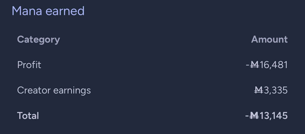I have not and will not buy any mana and I might receive promotional bonuses, but I don't think that will directly effect my profit (if it does, I will subtract the value added by the sign-up bonuses from the profit). Will extend time if needed. A definitive glitch or bug cannot resolve any option.