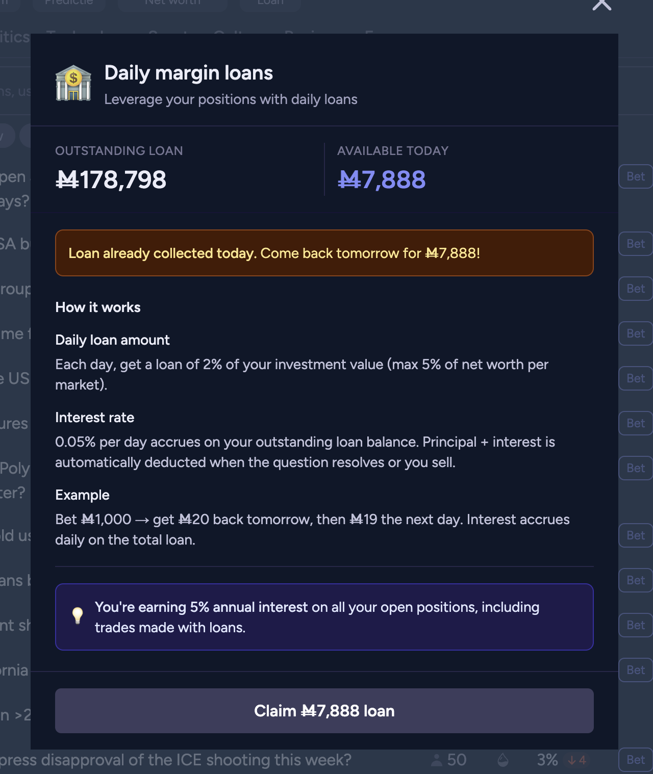 Loan balances will now accrue a fee of 0.05% per day, automatically included in loan repayment when selling shares or during market resolution.
